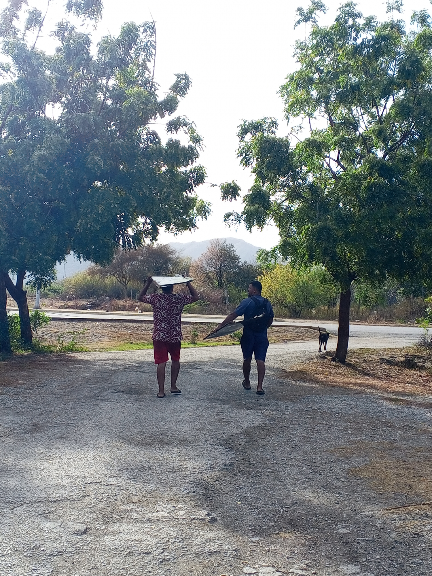 Two men are walking on a gravel path, carrying a large, flat object. The man in the front is wearing a short-sleeved patterned shirt and red shorts. The man behind him is wearing a short-sleeved blue…read more
