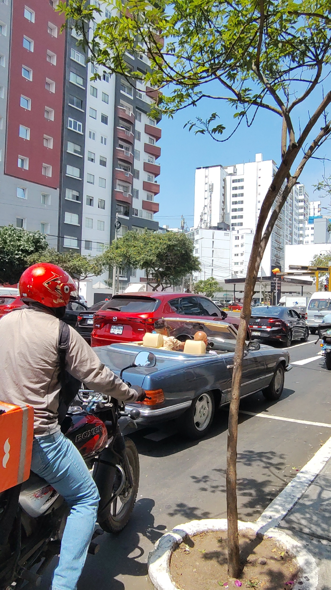 The image shows a delivery driver on a motorcycle, possibly stationary amidst traffic, in a street scene. The driver is wearing a red helmet and is seen from the back. Parked cars are visible in front…read more