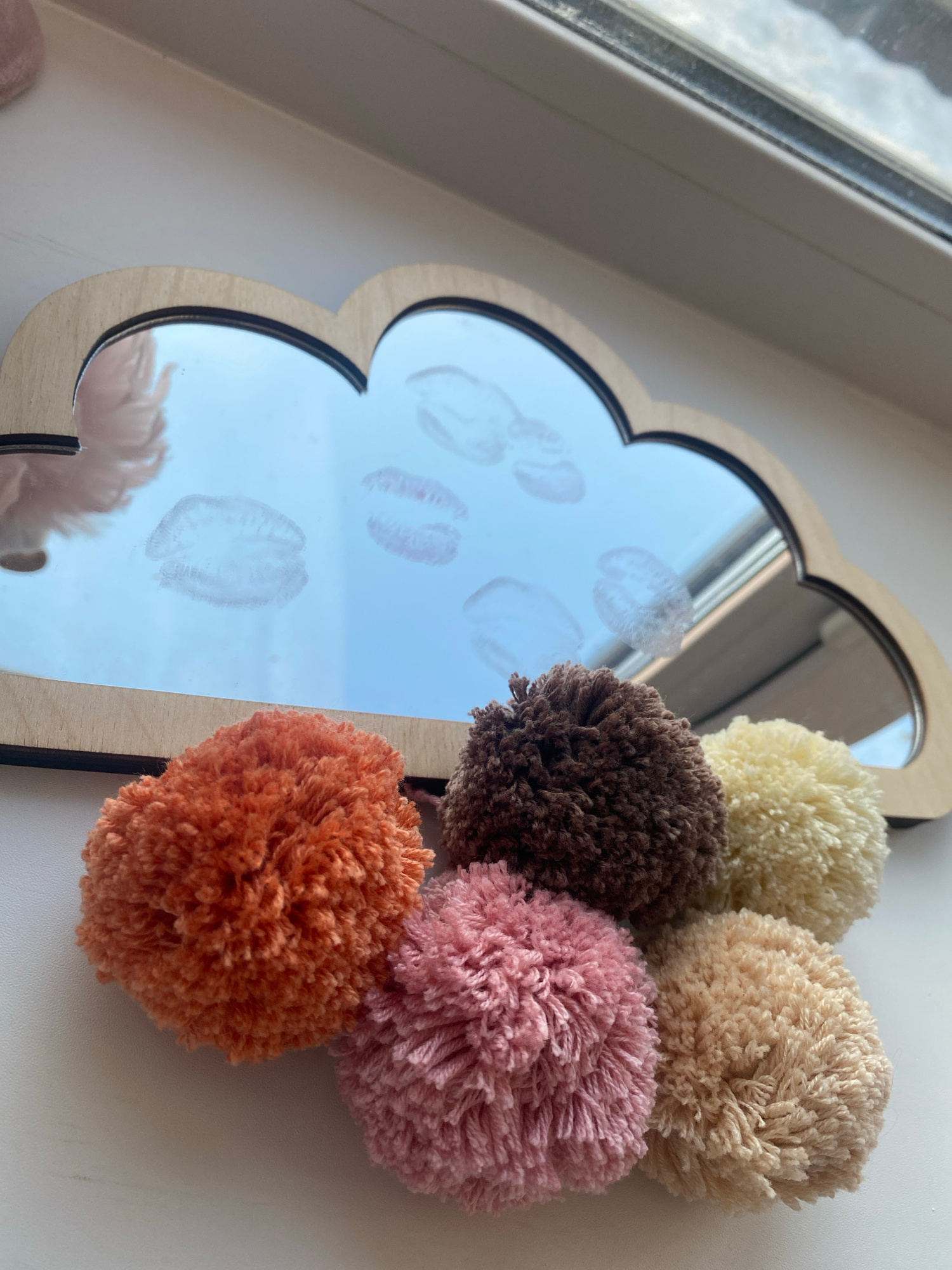 A close-up shot shows a cloud-shaped mirror with a light wood frame, decorated with six colorful pom-poms. The mirror reflects a window and the pale sky outside. Several faded lip prints are visible o…read more