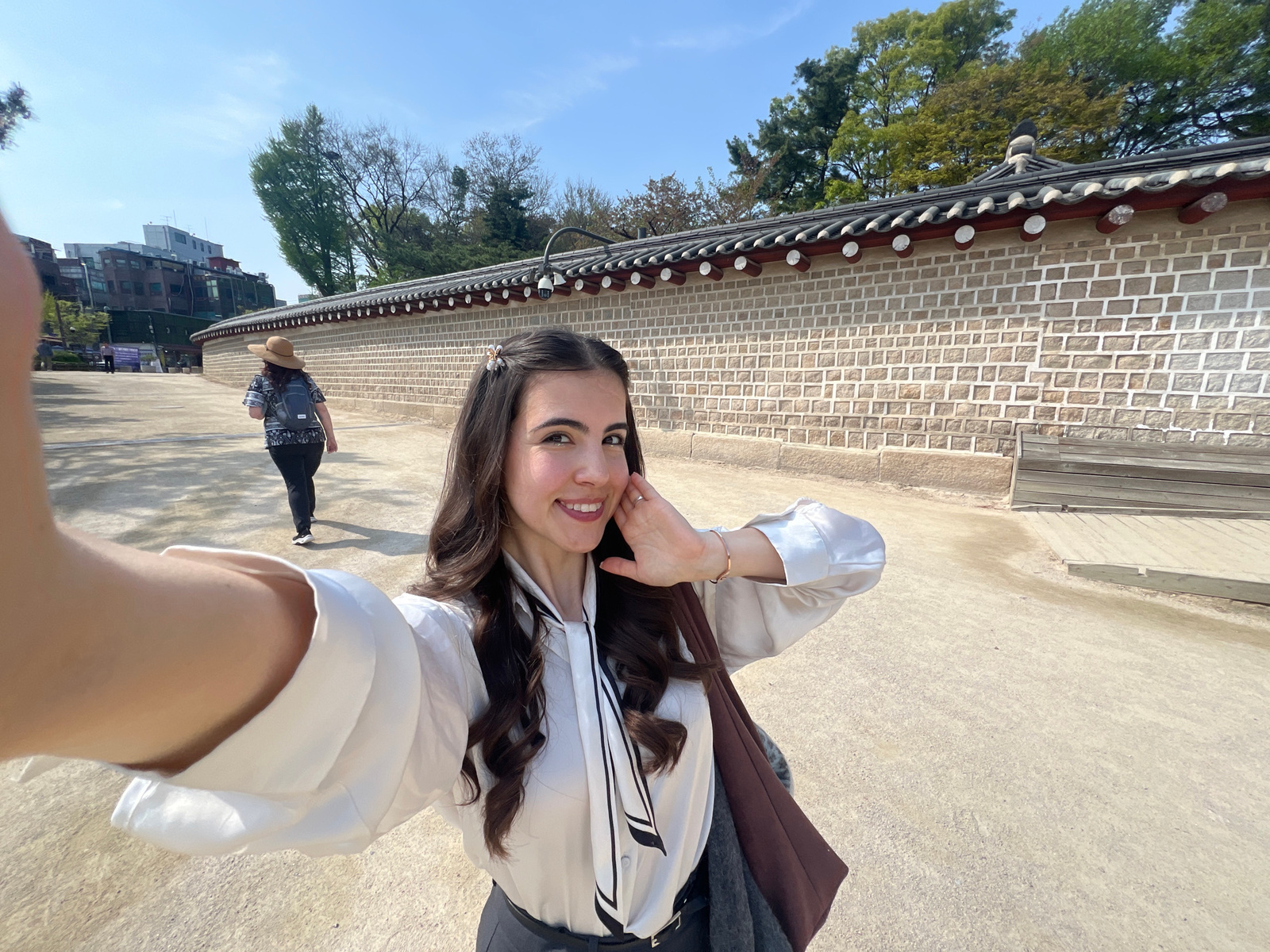 A selfie taken by a young woman dressed in a modern hanbok. The woman's hair is dark brown and curly, and she is wearing a white shirt with a black and white tie. A brick wall with a traditional Korea…read more