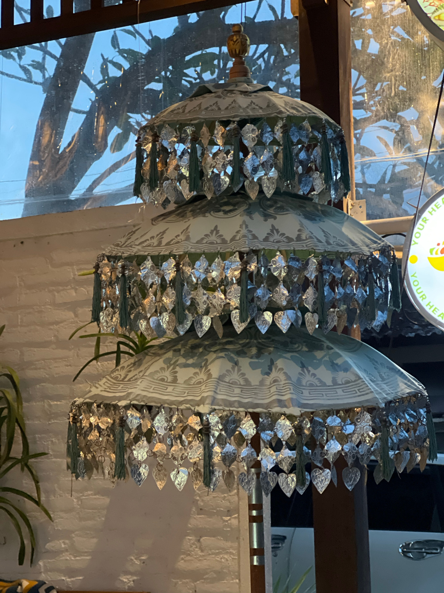 Hanging from the ceiling, there are three ornamented umbrellas, each decorated with silver heart-shaped adornments dangling from green tassels. The umbrellas are pale blue and white, featuring a patte…read more