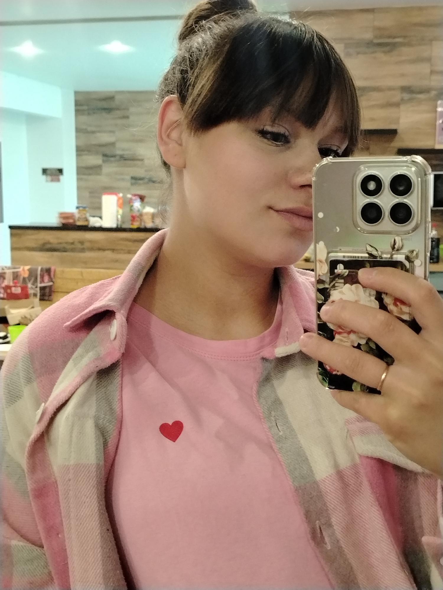The image captures a partial view of a young woman taking a selfie indoors. Her face is shown in profile, with dark bangs framing her forehead and her hair styled in a bun. She has subtle eye makeup and a composed expression, gazing towards the smartphone she holds. She is wearing a light pink t-shirt featuring a small red heart on the left chest, layered beneath an unbuttoned pink, white, and grey plaid flannel shirt. A simple gold band is visible on her ring finger. She holds a smartphone with a clear case that displays a floral pattern of white and pink roses on its back, partially obscured by her fingers. The phone's quad-camera system is prominently visible. The background, which is blurred, suggests an indoor setting with bright artificial lighting. Details include light-colored walls, overhead light reflections on the ceiling, and a wooden counter or paneling with various containers and items, possibly indicating a cafe or shop environment. The activity depicts a casual self-portrait moment. This scene is set in what is understood to be Chaikovsky, Russia. There is no discernible text visible in the image. | Open Wire
