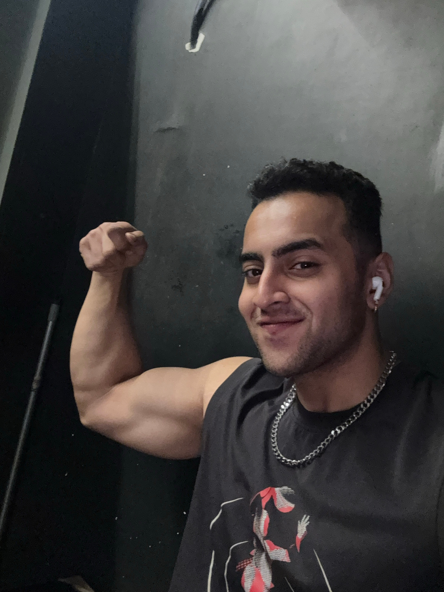 A man is posing in a room. He has short, dark hair, a chain necklace, and an earbud in his left ear. He is wearing a gray sleeveless shirt with a design. He is flexing his right bicep and smiling at t…read more