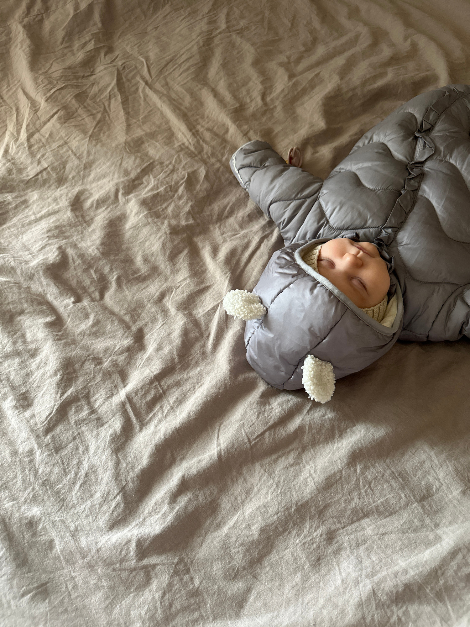 A baby sleeps in a gray, quilted snowsuit with white pom-poms on a tan-colored bedsheet. The location is not discernible from the image.