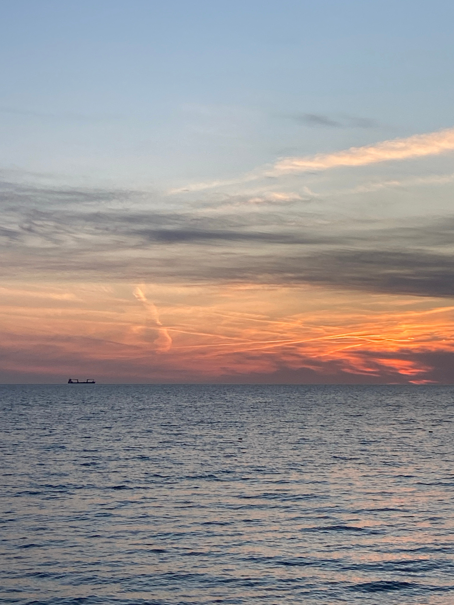 The image captures a sunset over the Adriatic Sea near Bar, Montenegro. The sky transitions from a pale blue to orange and red near the horizon, marked with contrails. A body of water is visible on th…read more