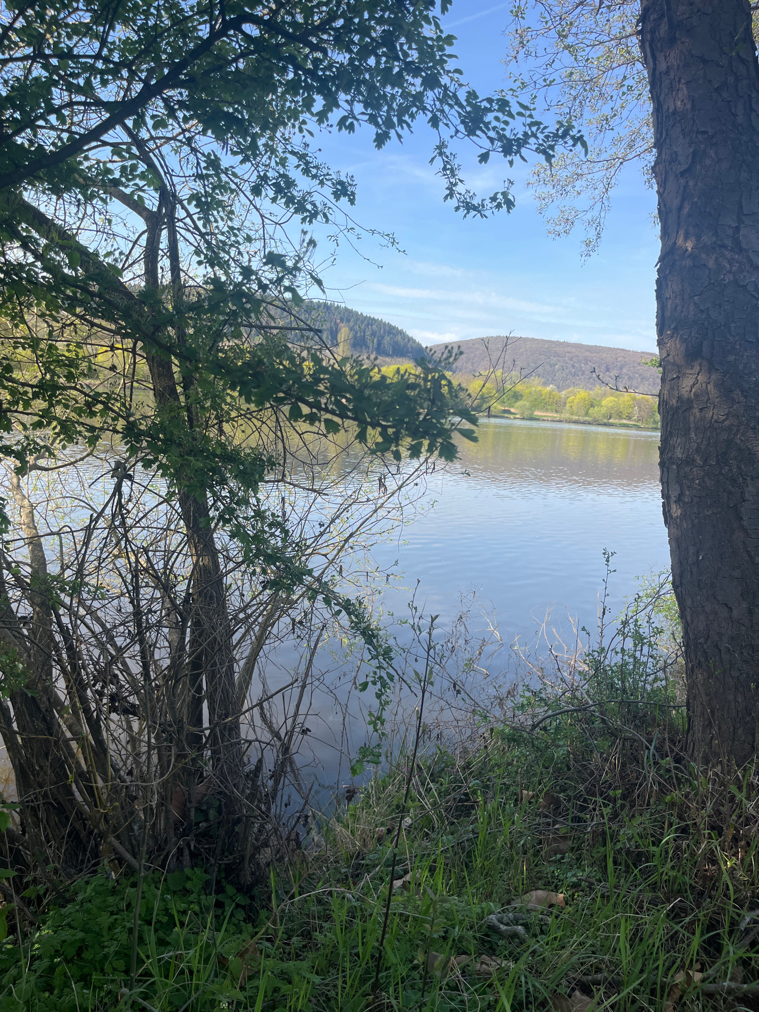 The image depicts a landscape view from Konz, Germany. The foreground consists of dense foliage, with trees framing the top of the image and branches scattered throughout. A body of water is visible b…read more