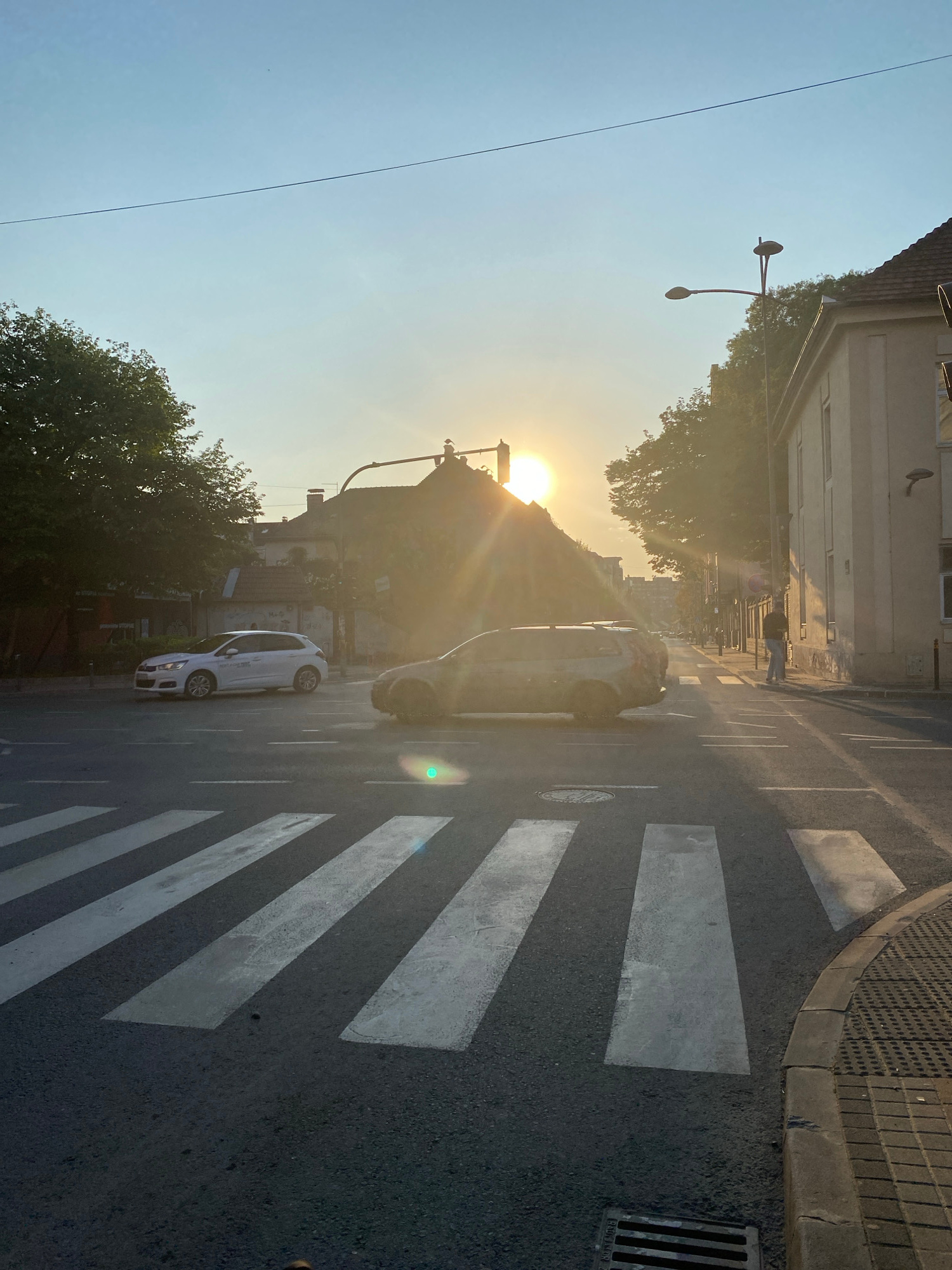 The image captures a street scene in Novi Sad, Serbia, at what appears to be sunrise or sunset. The sun is low in the sky, creating lens flare. A white car is driving on the road, which has a crosswal…read more