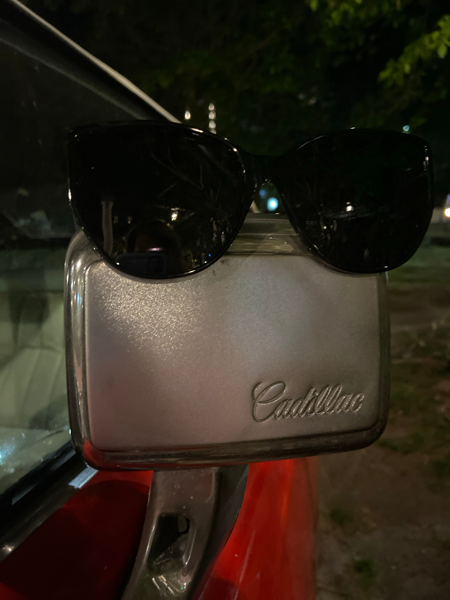 The image features a pair of black sunglasses perched on the side mirror of a vintage red Cadillac. The mirror is silver with the Cadillac emblem embossed on it. The car is parked outdoors, presumably…read more
