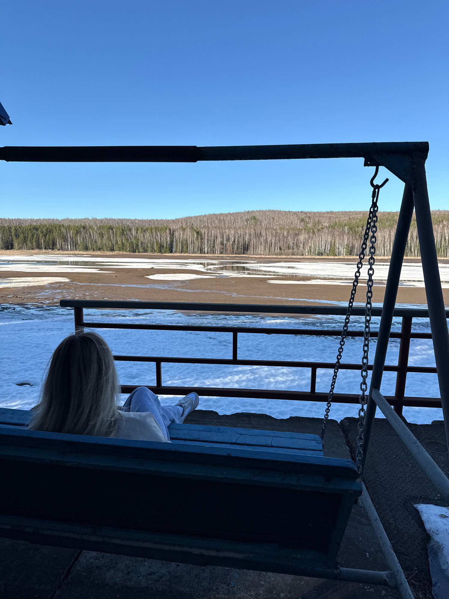 A person sits on a swing overlooking the water and a forested shoreline under a clear blue sky. The swing is suspended by chains from a metal frame. The person wears light-colored clothing and has blo…read more
