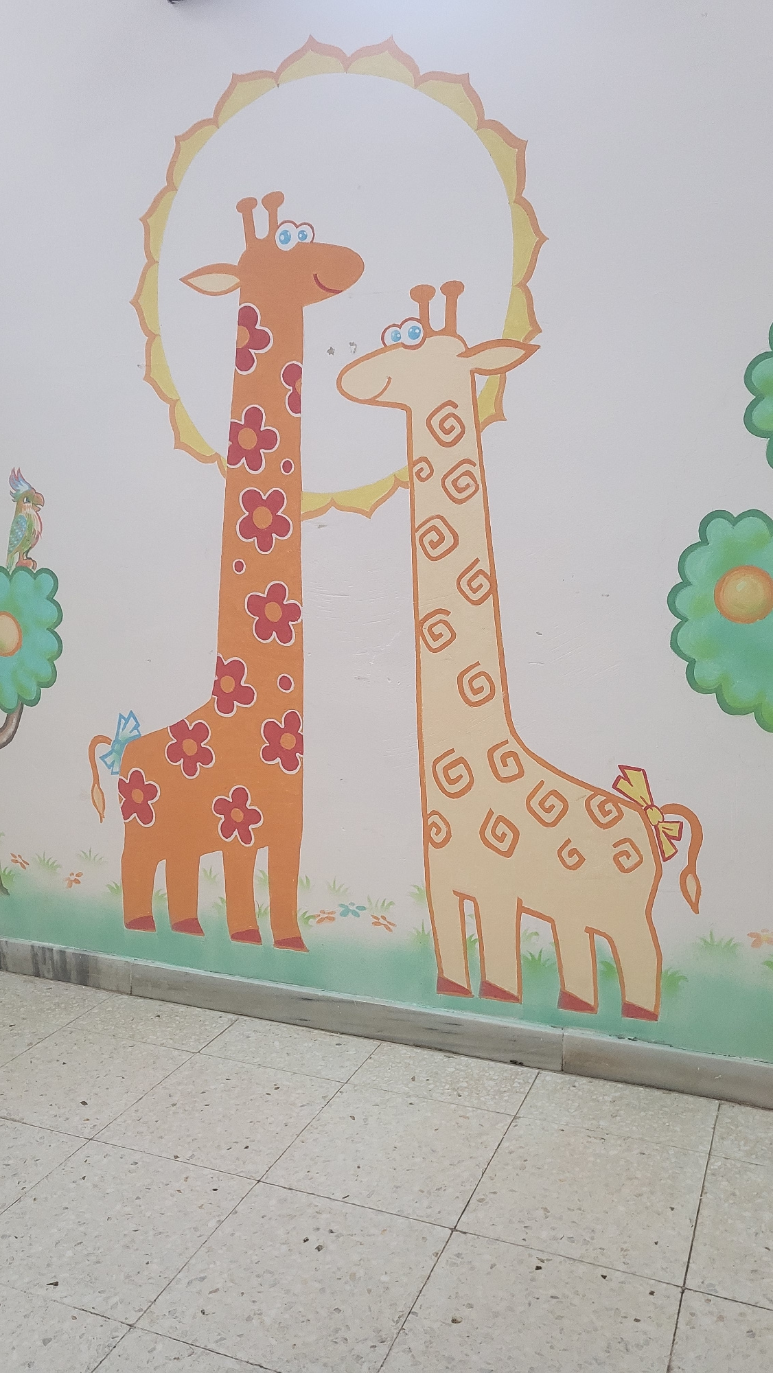 This image captures a vibrant wall mural featuring two stylized cartoon giraffes, painted on a light-colored wall in what appears to be an indoor setting. The upper giraffe is a lighter orange-tan wit…read more