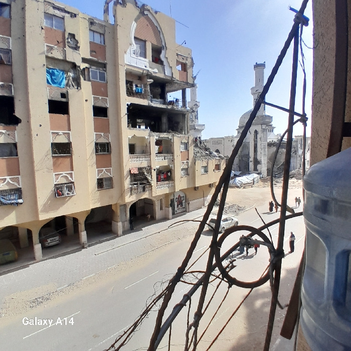The image depicts a severely damaged urban street scene in Khan Yunis, Palestinian Territory, under a clear daylight sky. In the immediate foreground on the right, a partially visible translucent blue…read more