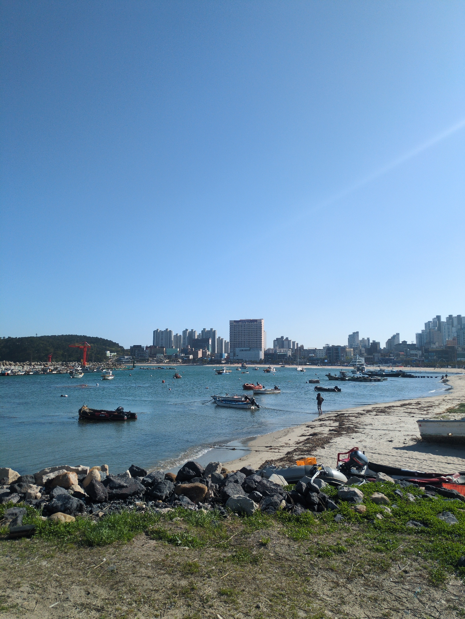 The image shows a coastal scene in Ulsan, South Korea, likely Haeundae Beach. The sky is a clear blue. The coastline features a mix of sand and rocky areas, with sparse vegetation growing on the rocks…read more