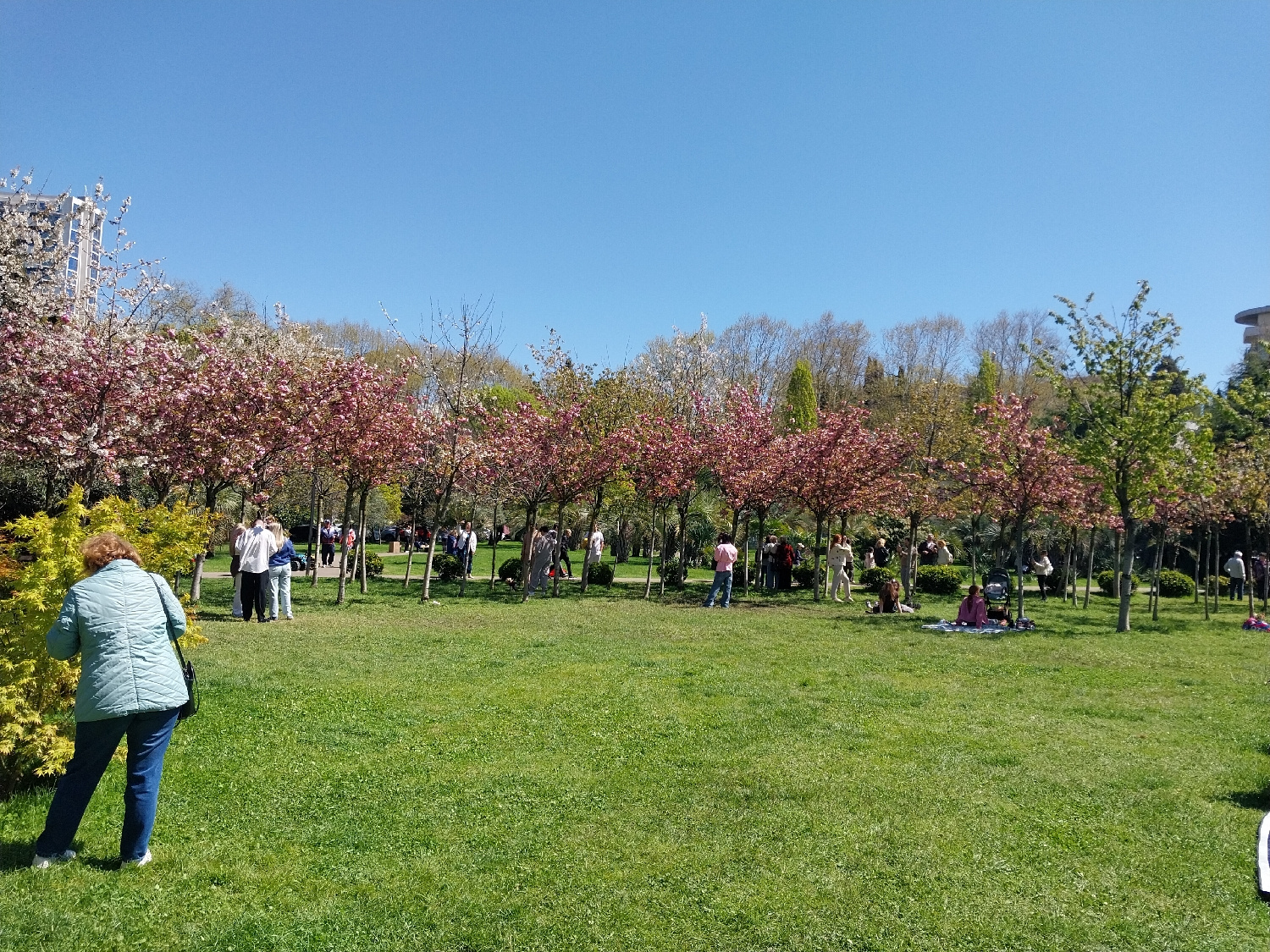 The image depicts a vibrant spring day in a park, likely in Sochi, Russia. The scene is characterized by bright green grass and numerous flowering trees, predominantly cherry blossoms, displaying both…read more