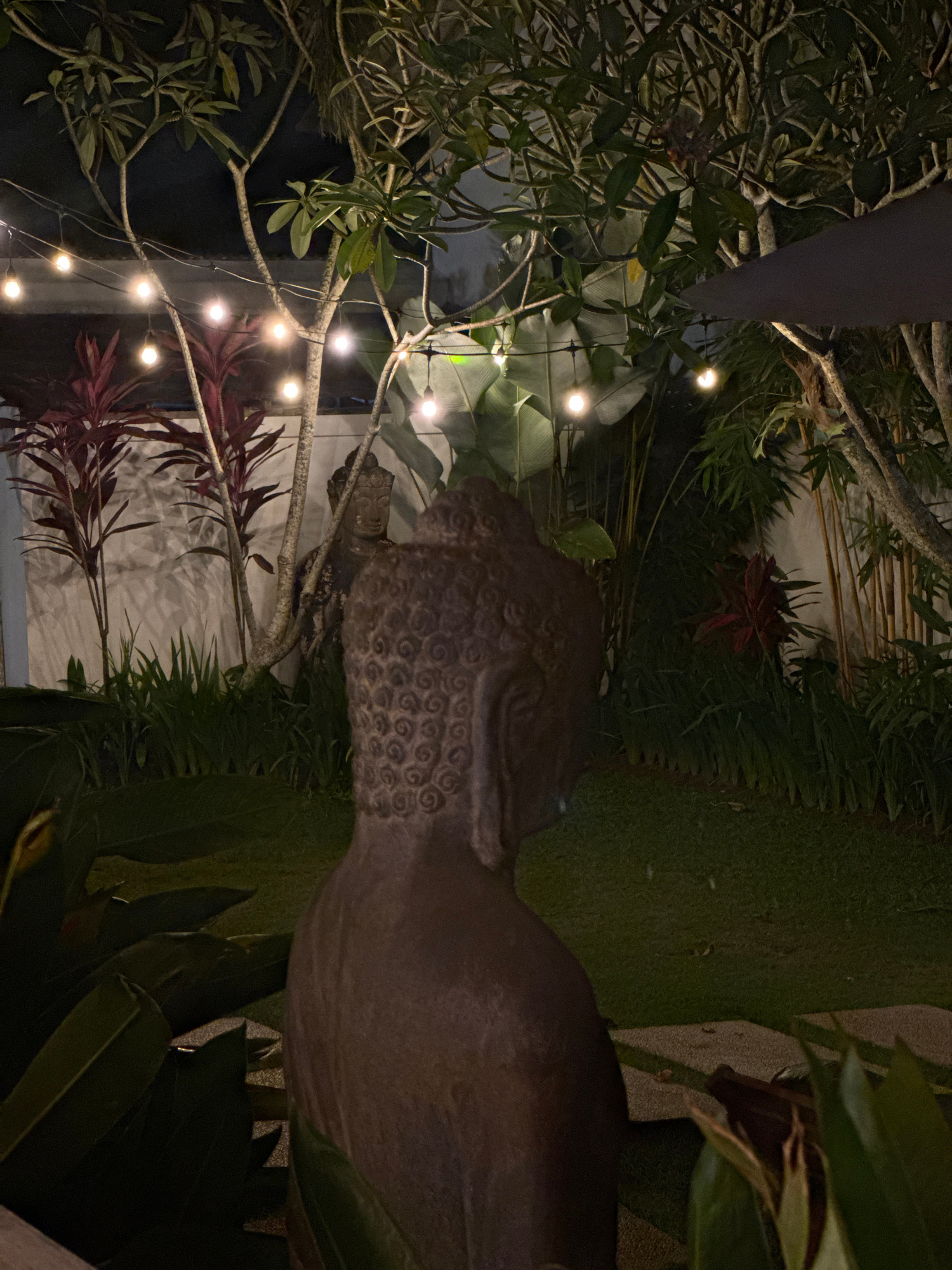 The image depicts an outdoor scene, likely a garden, in Kuta Selatan, Indonesia, at night. A stone statue of a human figure is prominently featured, surrounded by dense foliage, including trees, grass…read more
