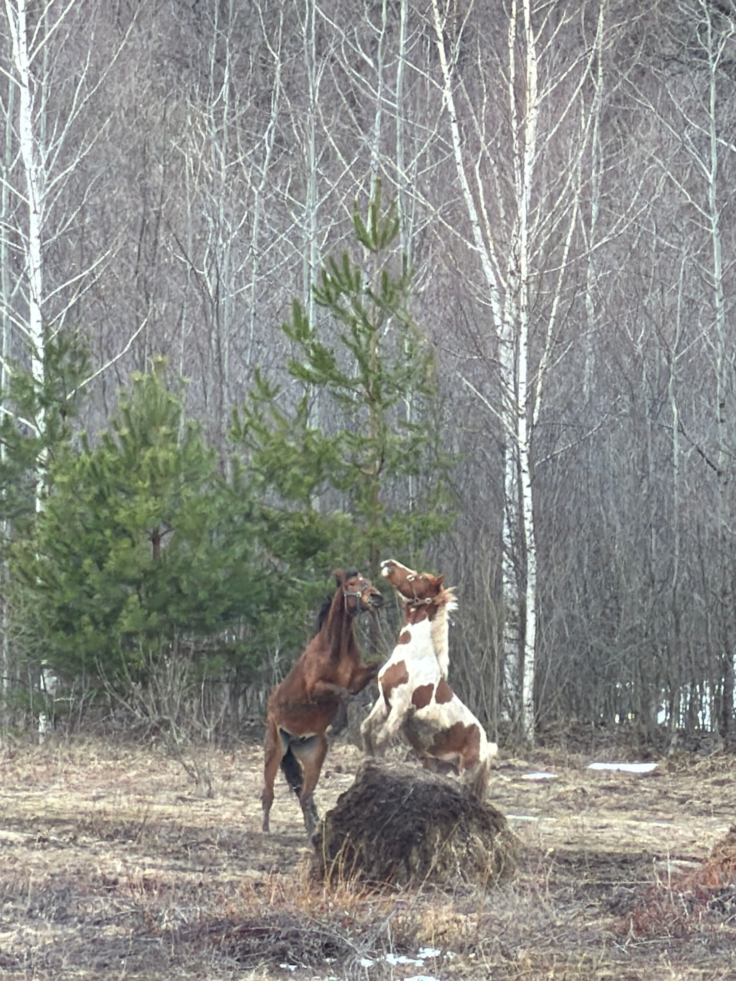 The image depicts two horses in a wooded area, likely in the vicinity of Noviy, Russia, given the prompt's reference. One horse is brown and white with spots, while the other is solid brown. They are…read more