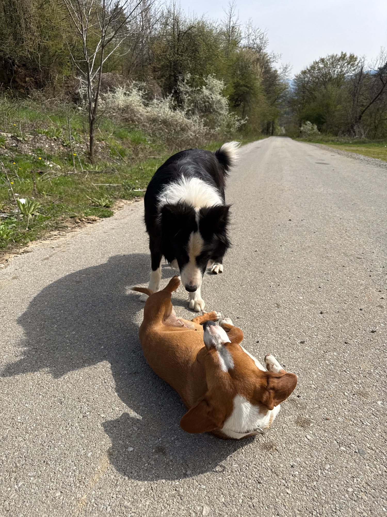 Two dogs, a black and white border collie and a tan and white dog, are interacting on an asphalt road. The tan dog is lying on its back with its paws in the air, while the border collie is standing over it. The road is bordered by trees and bushes. The location is Berkovitsa, Bulgaria. | Open Wire