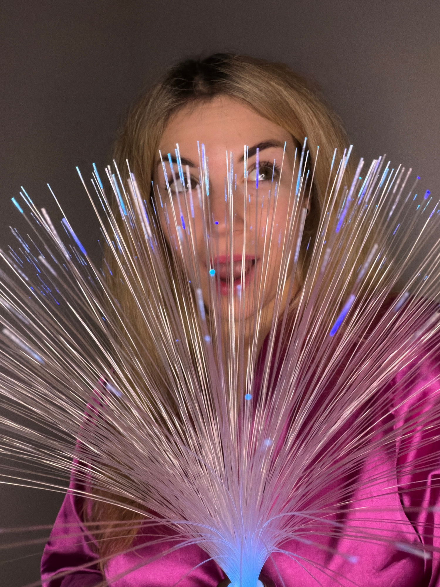 A woman with blonde hair is partially obscured by a fiber optic lamp. The light is emanating from the bottom right corner, obscuring the majority of the woman's face. The fibers spread outwards across…read more