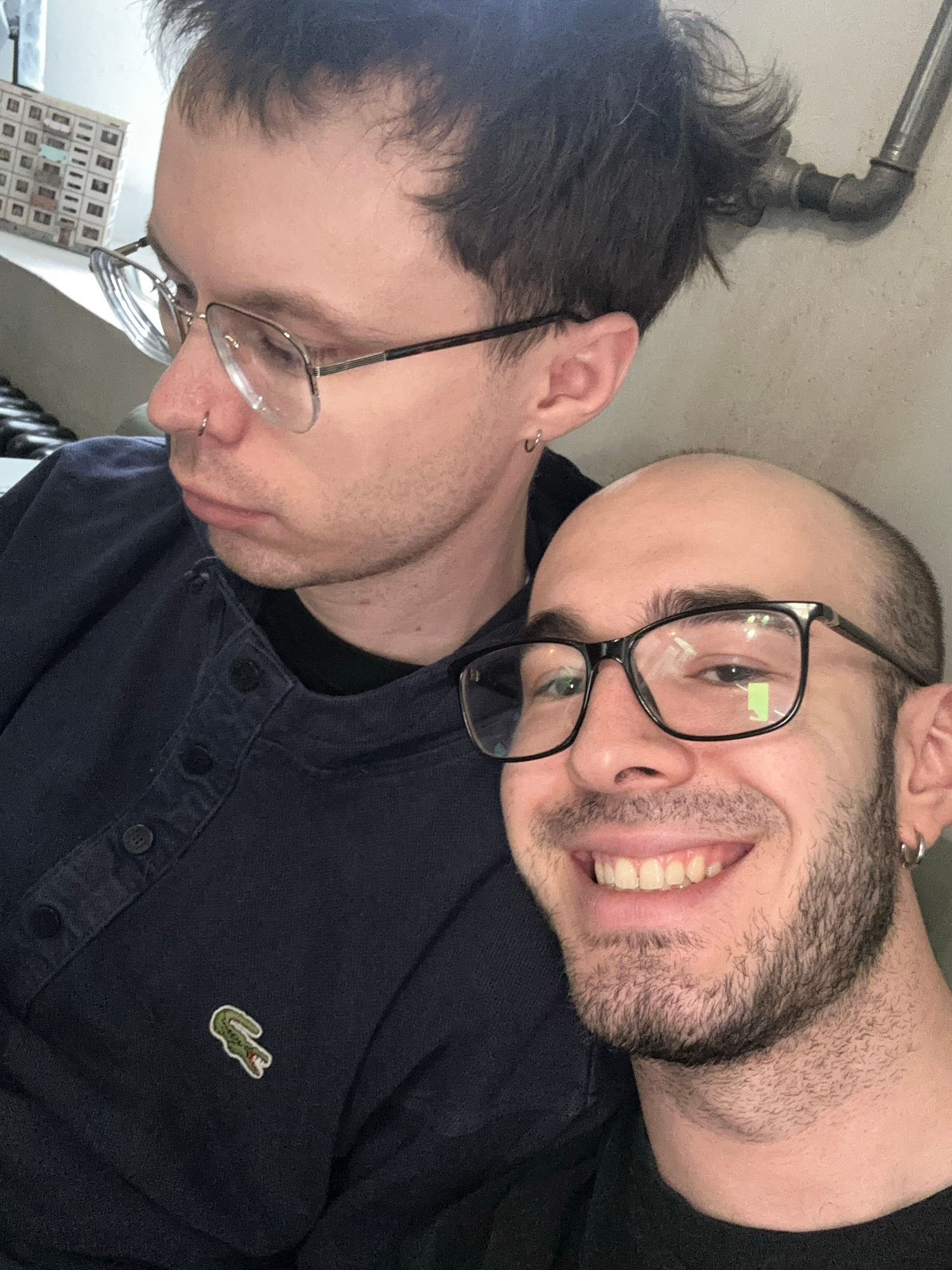 The image depicts two men in close proximity. One man is partially bald with a beard and glasses, smiling broadly. He is wearing a dark shirt with a Lacoste logo. The other man, with dark hair and gla…read more