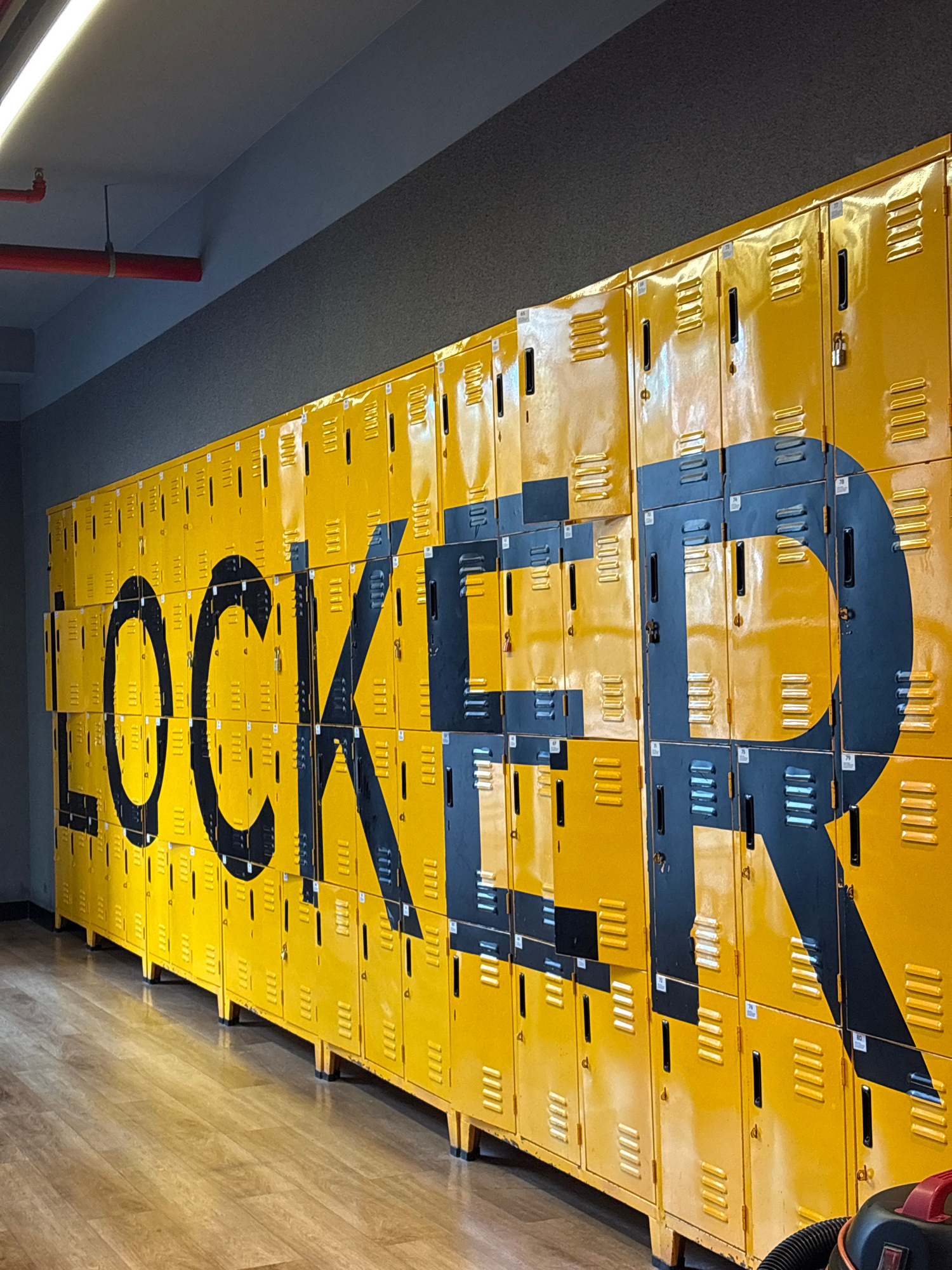 The image depicts a wall or ceiling covered in yellow lockers, each with black markings that collectively form the word "LOCK." The perspective is from a low angle, looking upward, giving the lockers…read more