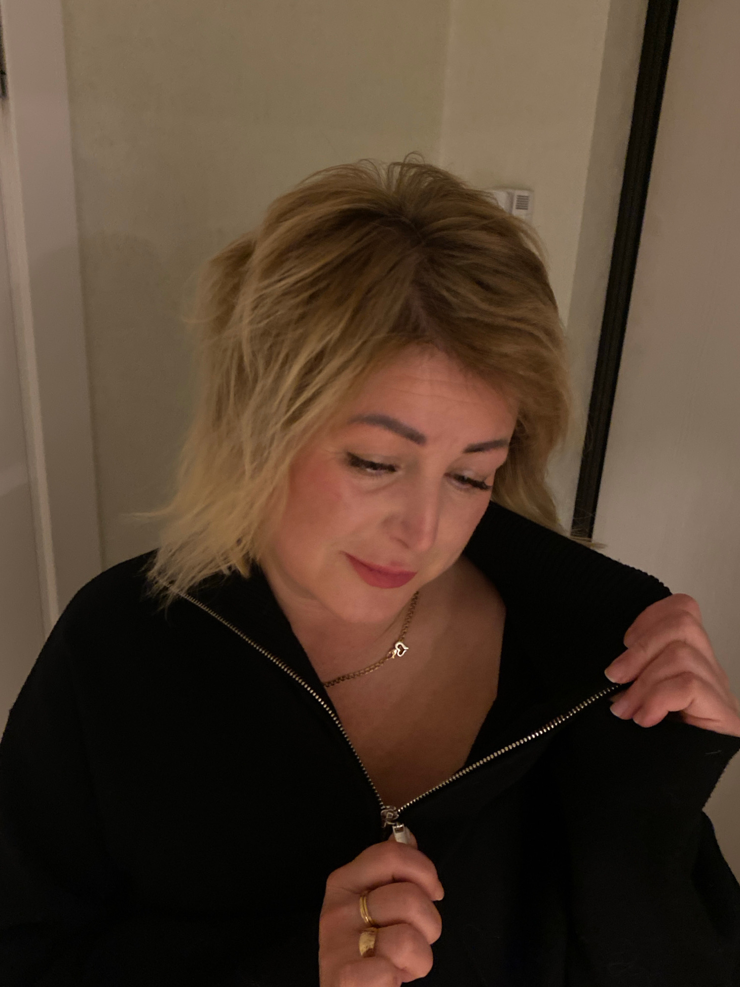 A woman with blond, shoulder-length hair is partially unzipping a black jacket. She has fair skin and is wearing a gold necklace with a heart pendant. Her right hand, with two gold rings on her finger…read more