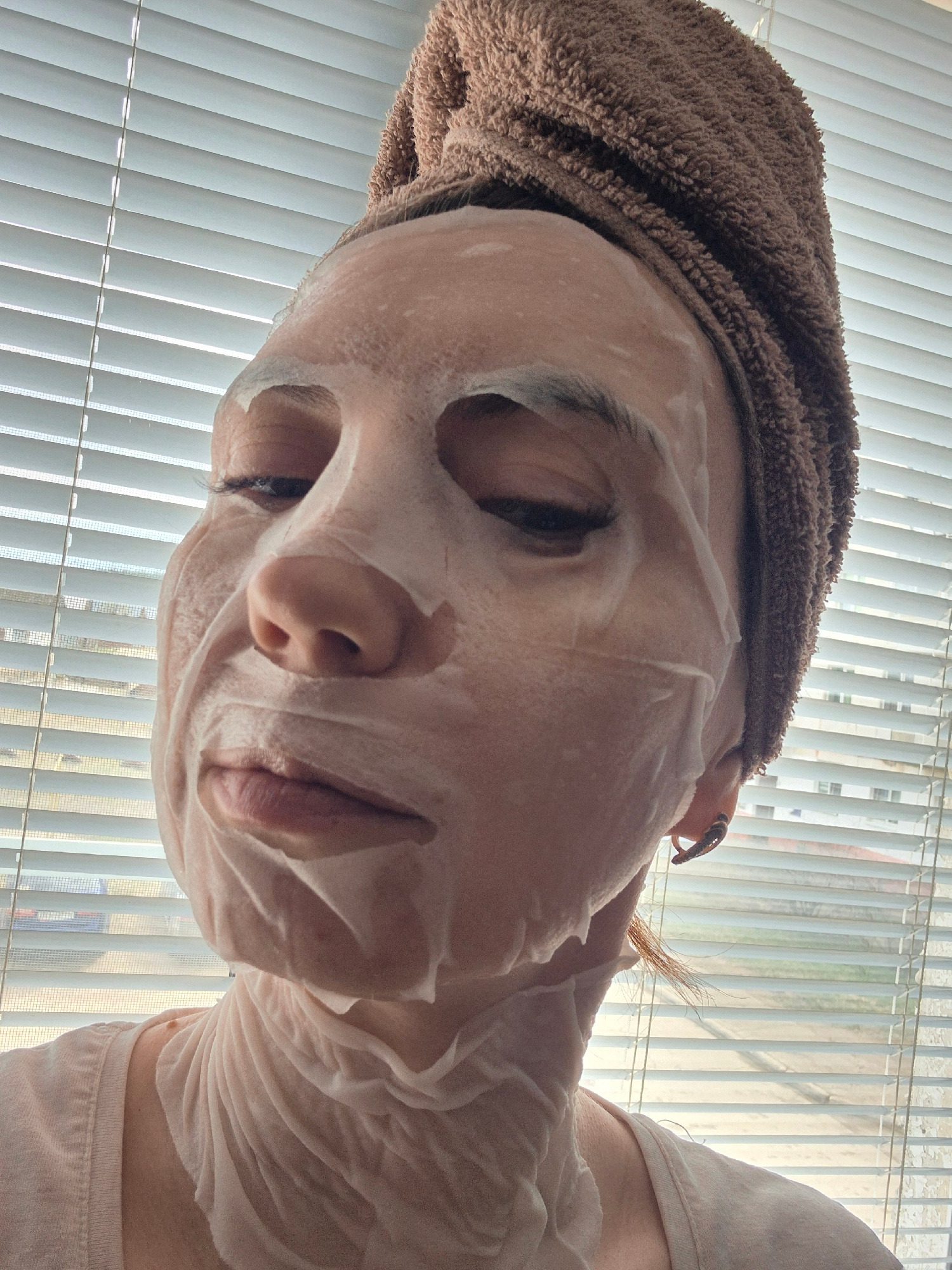 A medium close-up shot depicts a person's face obscured by a sheet mask, with a brown towel wrapped around their head. The person appears to be looking down at the camera. Behind the person, a window…read more