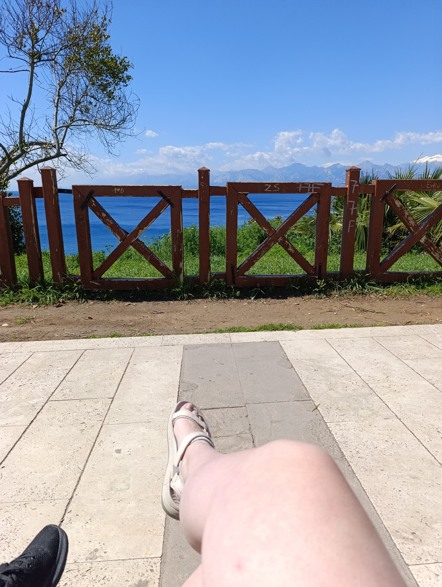 The image shows a person sitting on a stone-tiled surface, likely a bench or platform. Their left leg and foot, shod in a white sandal, are visible in the foreground, along with a black sneaker at the…read more