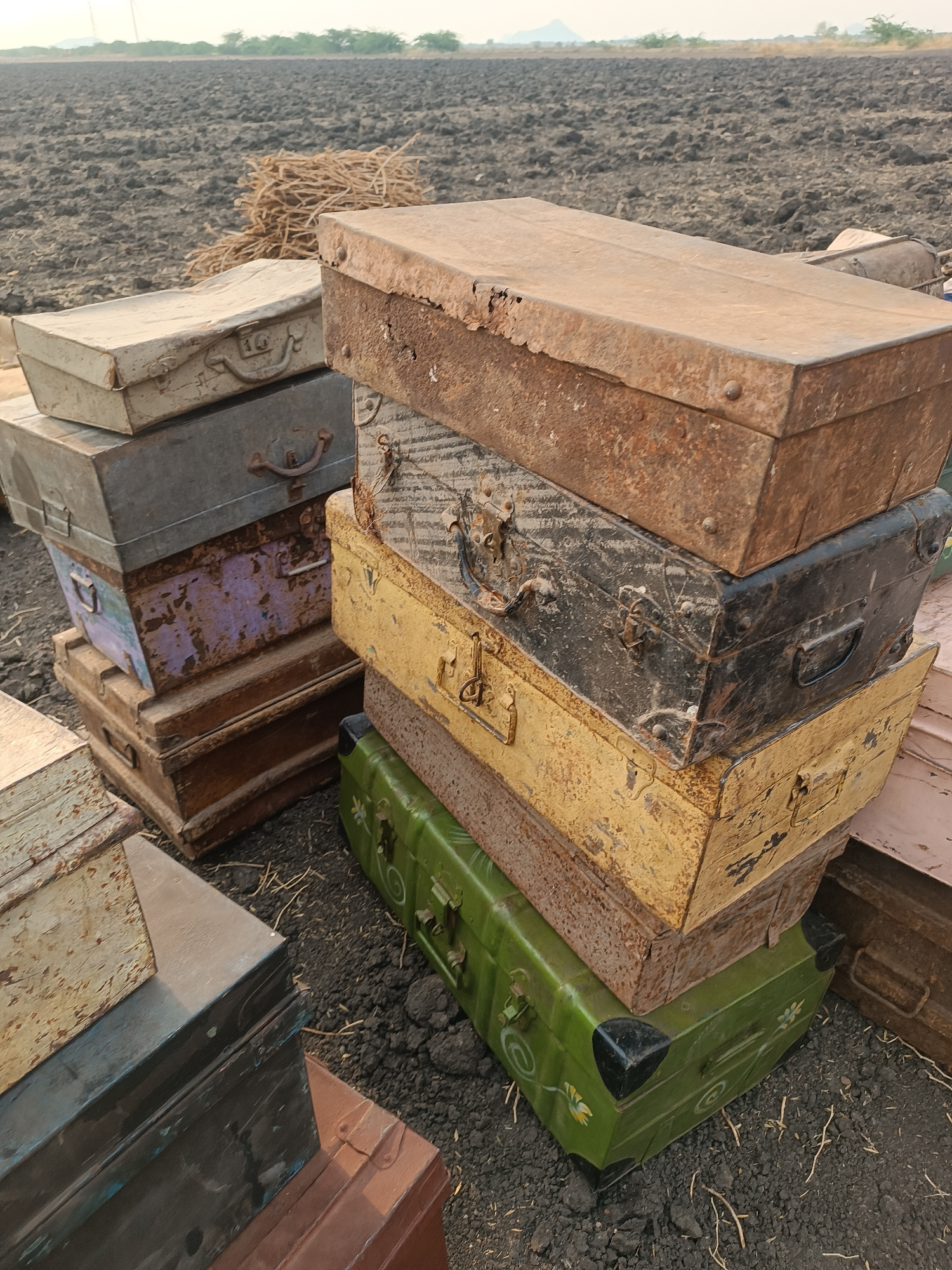 The scene is an outdoor setting within a plowed agricultural field in Kottalapalli, India. No individuals are present. The foreground and mid-ground are occupied by numerous weathered metal trunks and…read more