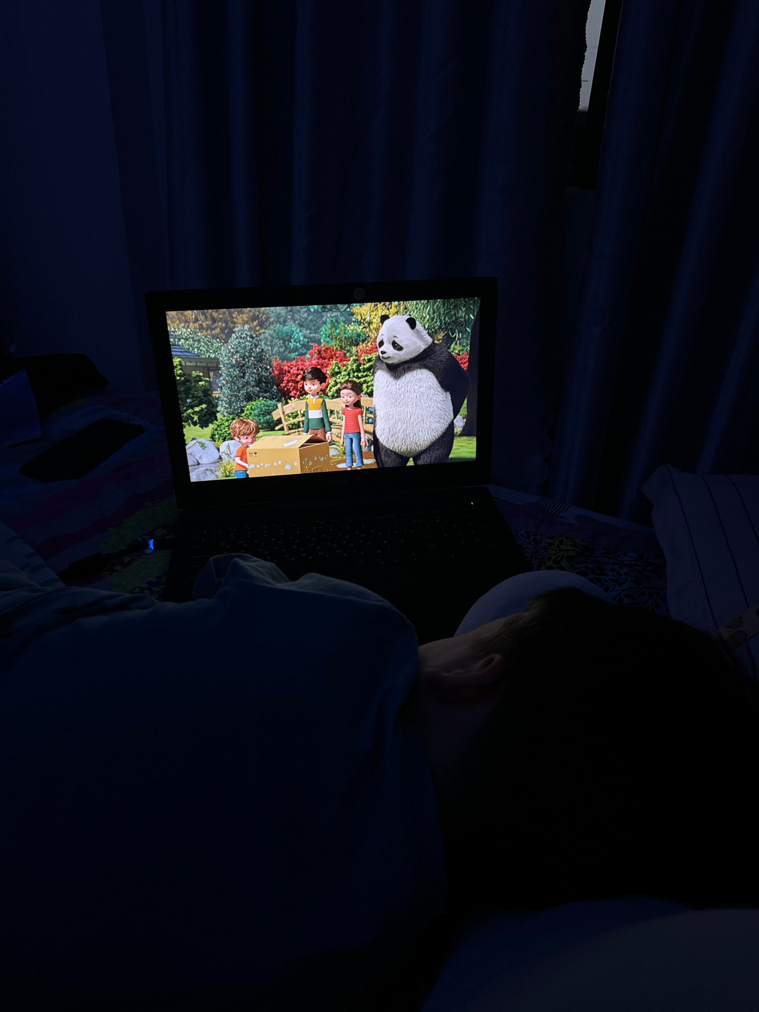 A child sits in a dark room, looking at a laptop screen. The screen displays an animated scene featuring a panda and several other characters in a garden setting. The room appears to be a bedroom, wit…read more