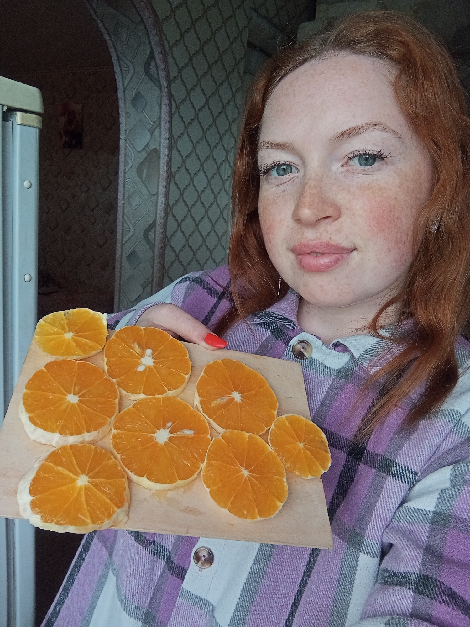 A red-haired woman with freckles is lying down indoors. She is holding a wooden board with nine sliced orange rounds on it. She is wearing a plaid shirt with white and light purple. The background inc…read more