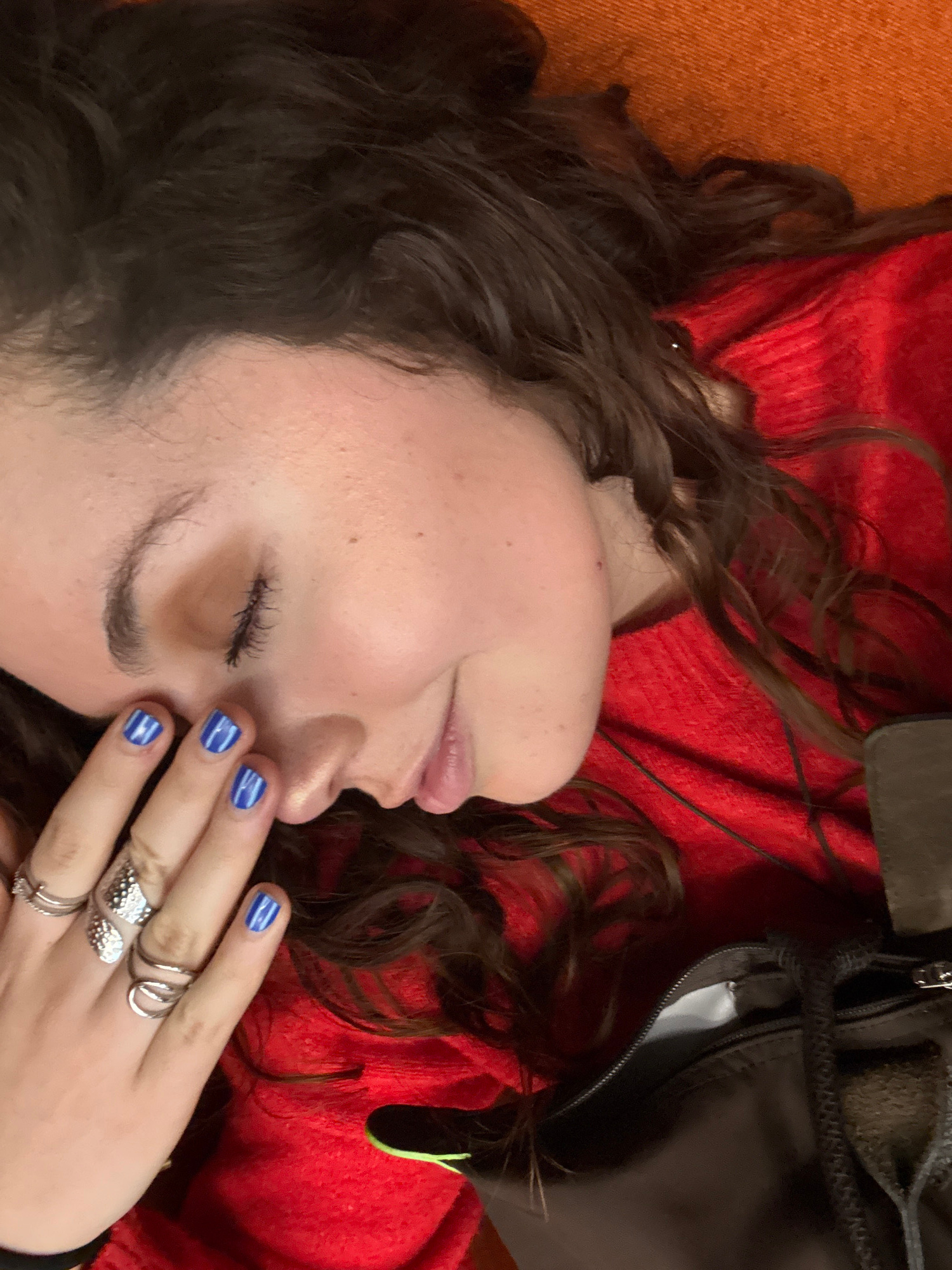 A close-up, canted, personal photograph shows a young woman lying on her back, eyes closed, her right hand touching her cheek and mouth. Her skin is fair with a few visible freckles. Her dark, wavy ha…read more