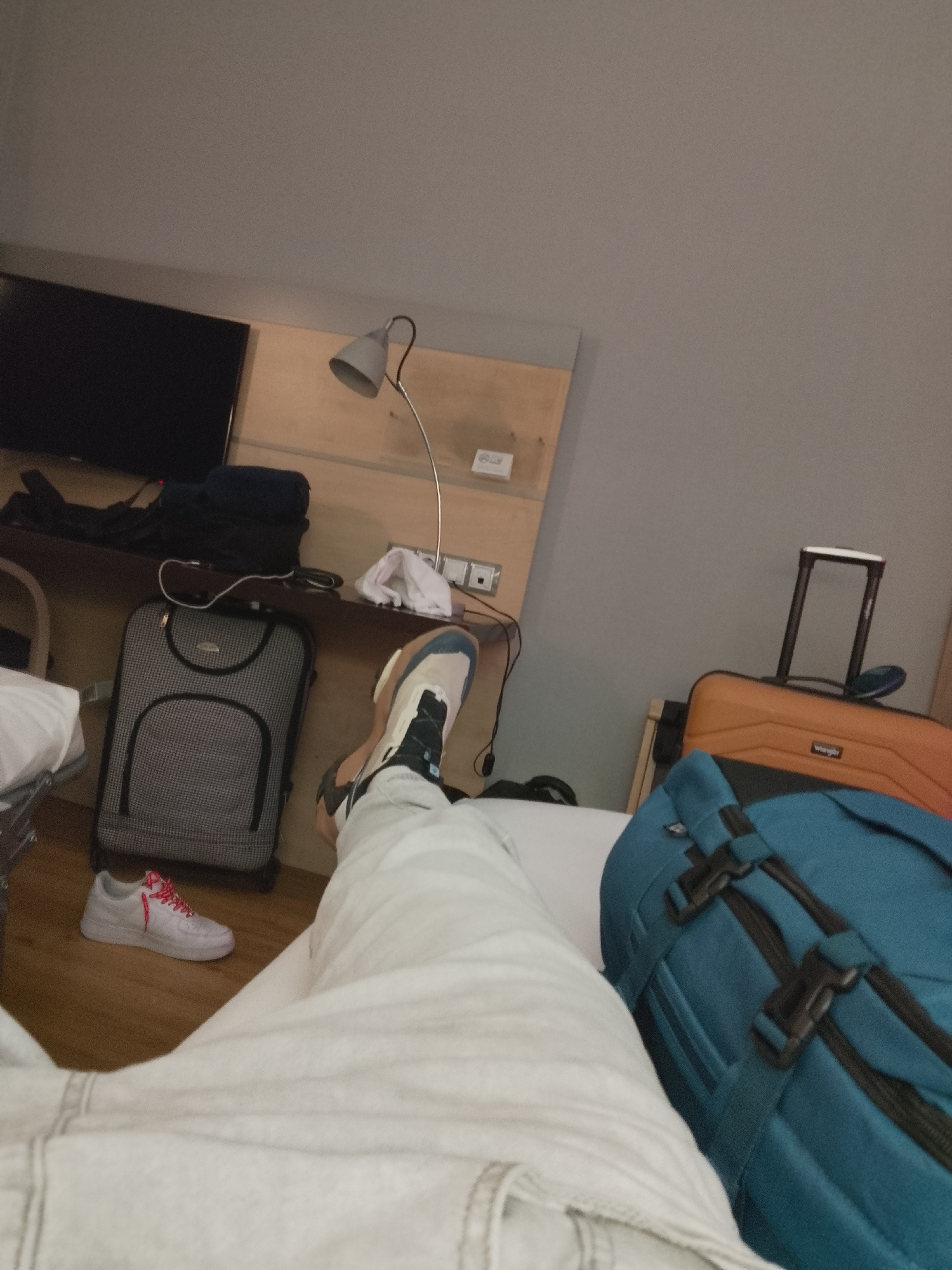 The image depicts an interior scene, potentially a hotel room, with a bed in the foreground occupied by an individual whose legs are visible. The person wears light-colored pants and one sneaker is on…read more
