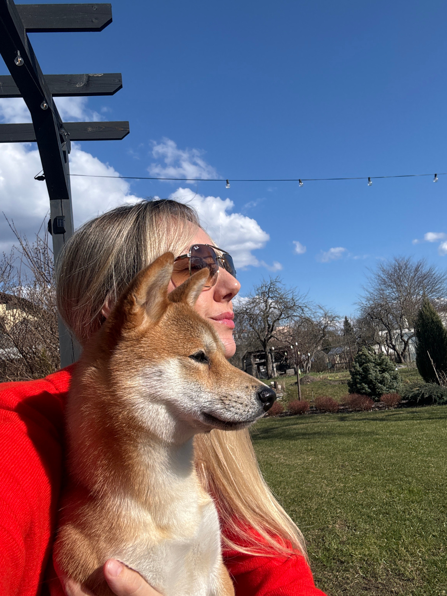 A woman with blonde hair and sunglasses is holding a Shiba Inu dog outside on a sunny day. The location is likely in Carnikava, Latvia, given the prompt. The woman is wearing a red top. Behind them, t…read more