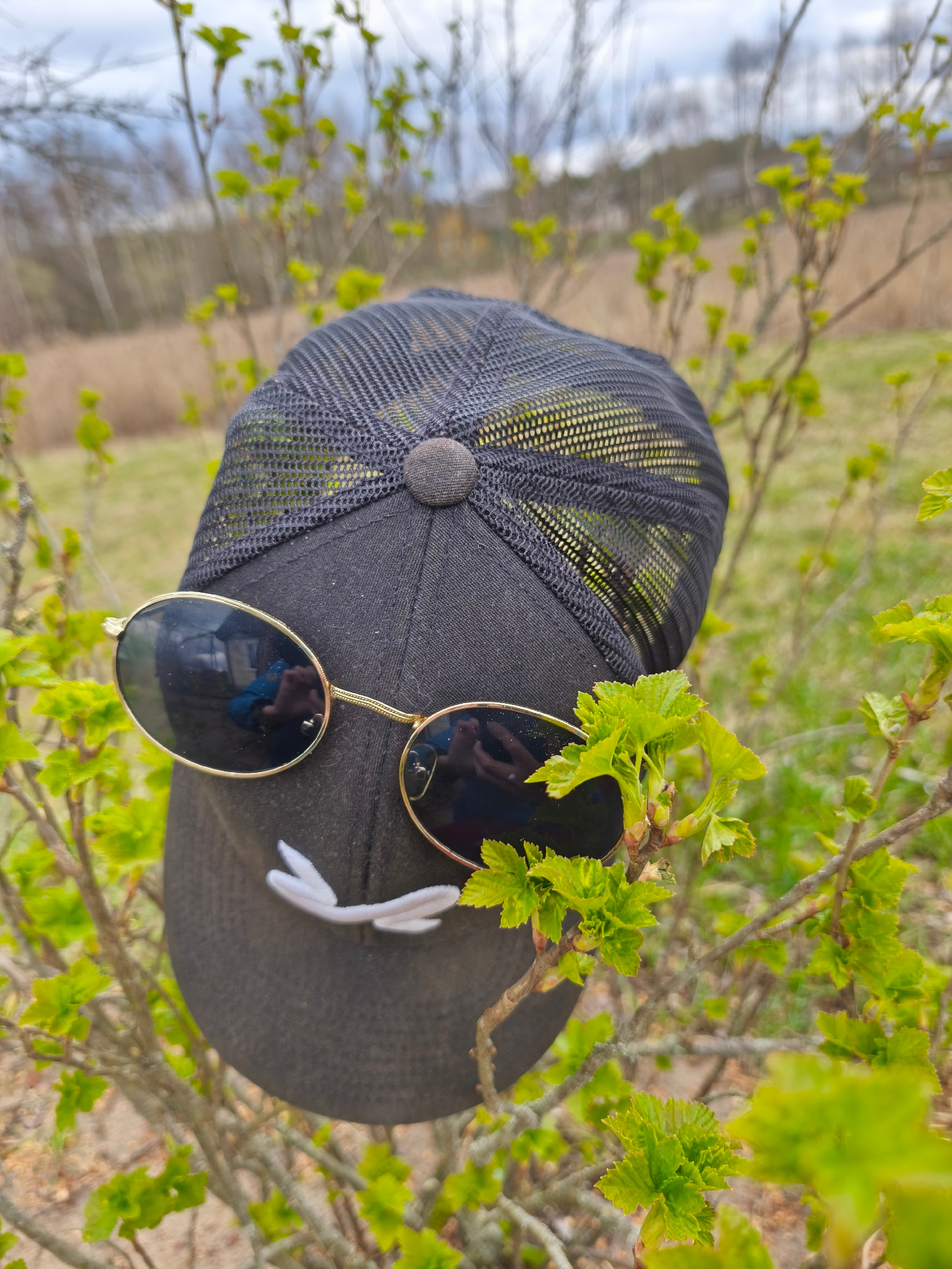 The image shows a black baseball cap with a black mesh back and a button on top, placed on a bush with green leaves. The cap also has a pair of round, gold-rimmed sunglasses and a white, abstract shape attached to the front. The background includes other bushes, trees, and a field. The photograph was taken in the city of Парэчча, Belarus. | Open Wire