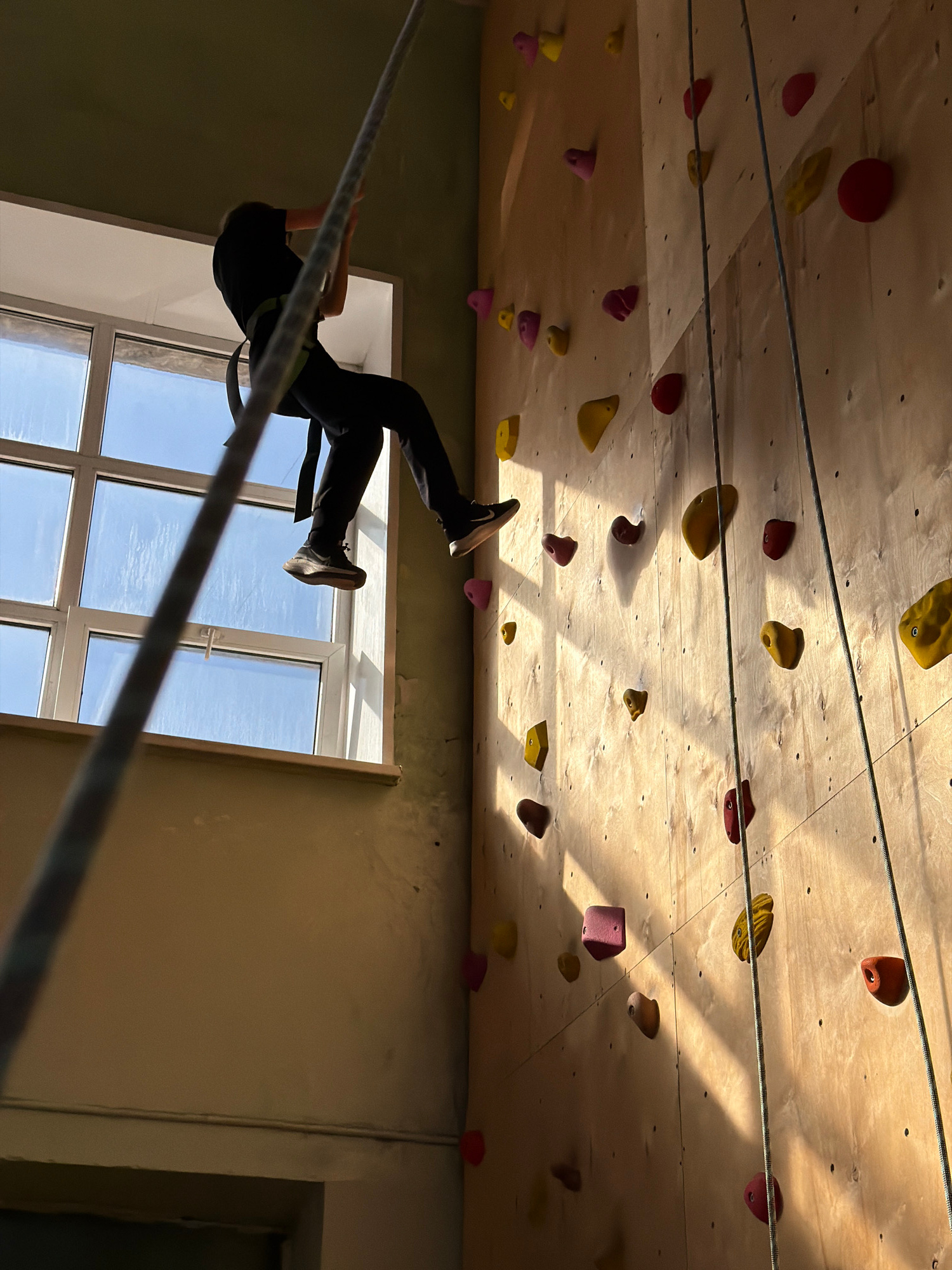 A person is suspended by a rope in front of a climbing wall inside a building. The climbing wall is wooden and covered with various colored climbing holds. A window with a grid pattern is behind the p…read more