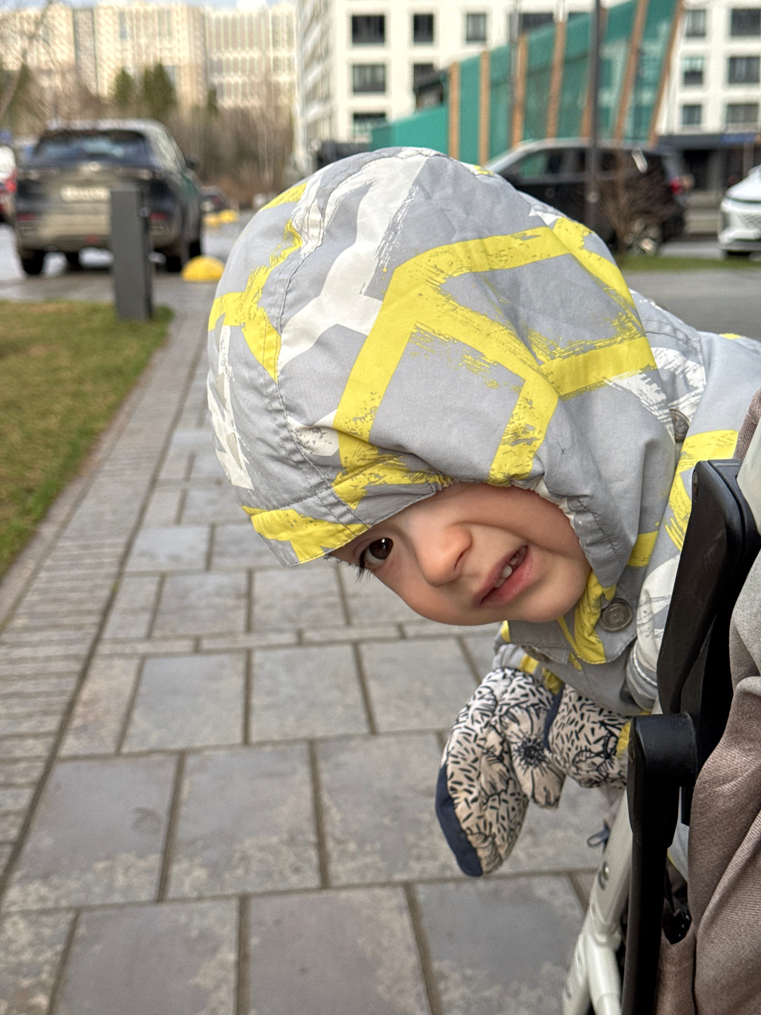 The image, taken in Izhevsk, Russia, captures a happy baby smiling and looking upside down from a stroller in an outdoor, urban setting during daytime. The baby is wearing a grey and yellow patterned…read more