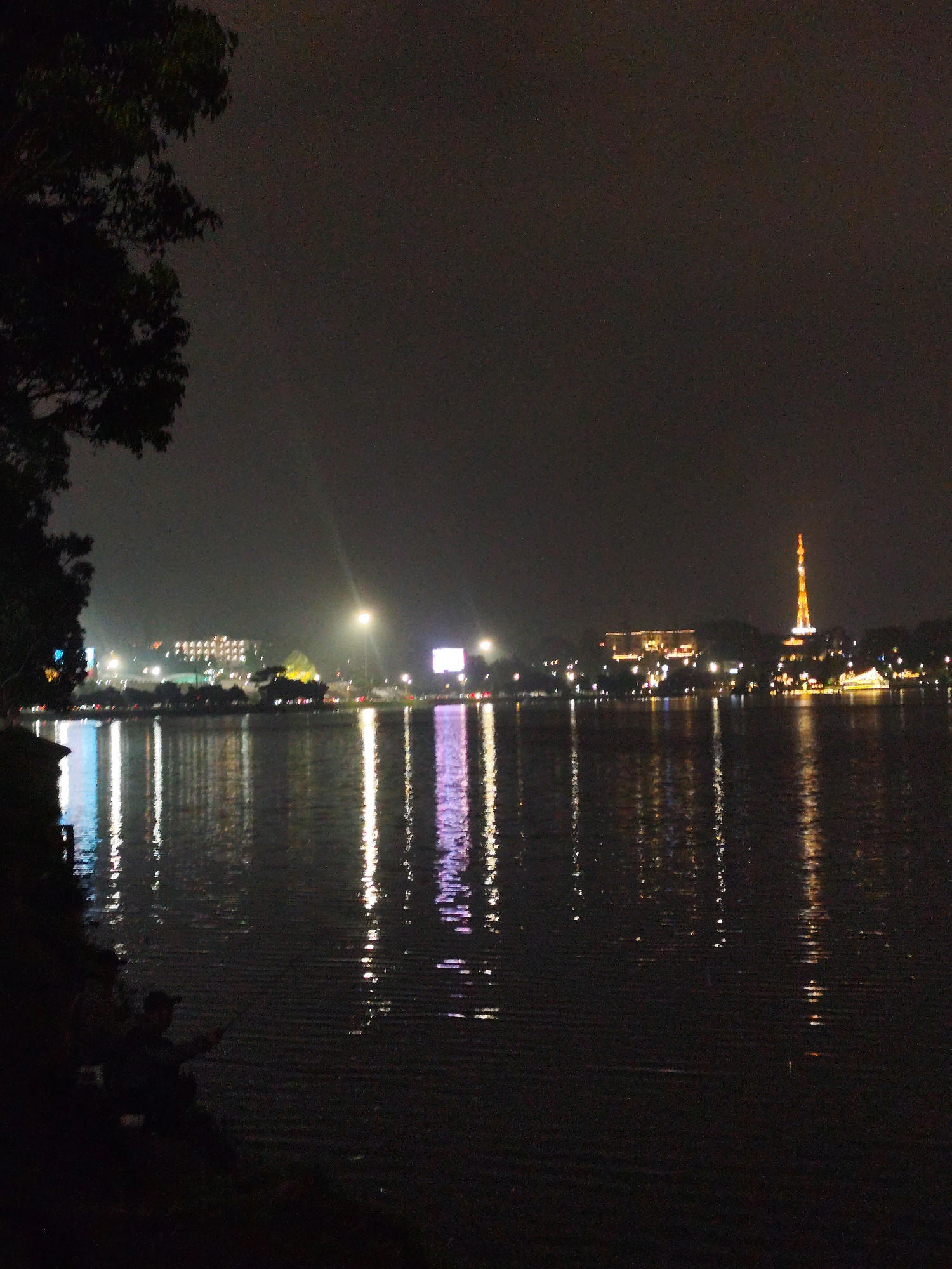 The image depicts a night scene at Xuan Huong Lake in Da Lat, Vietnam. A dark tree occupies the left foreground. The lake is reflective, showing illuminated buildings, including a tower and another la…read more