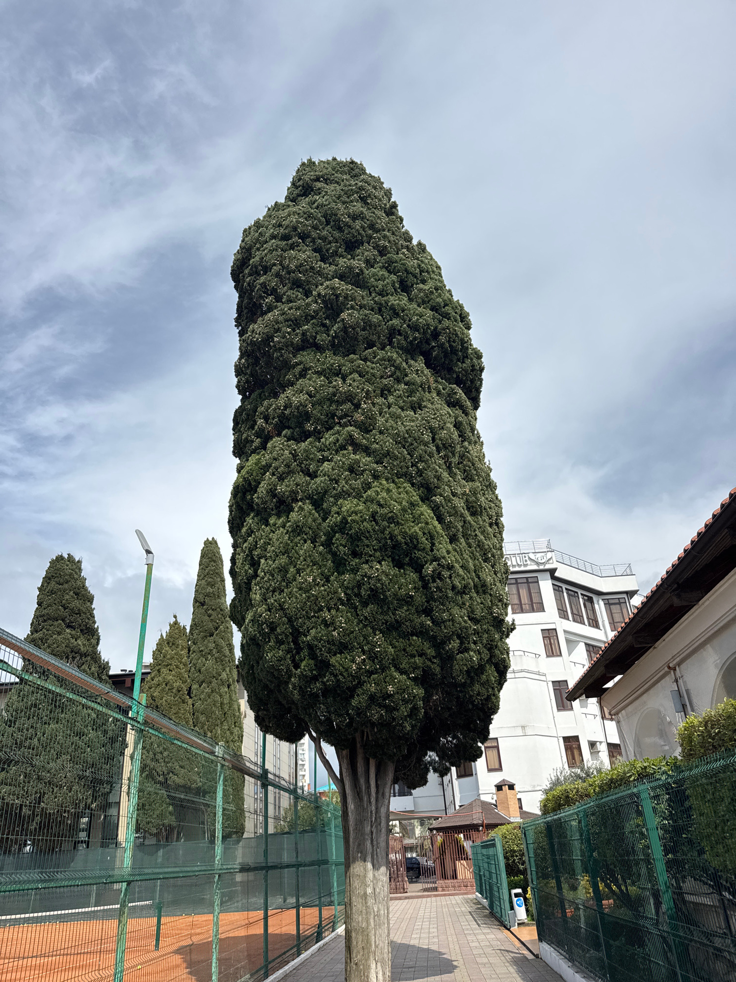 The image shows a tall, cylindrical tree with dense green foliage located in Sochi, Russia. The tree stands next to a tennis court, with a green chain-link fence separating the court from the surroundβ¦read more