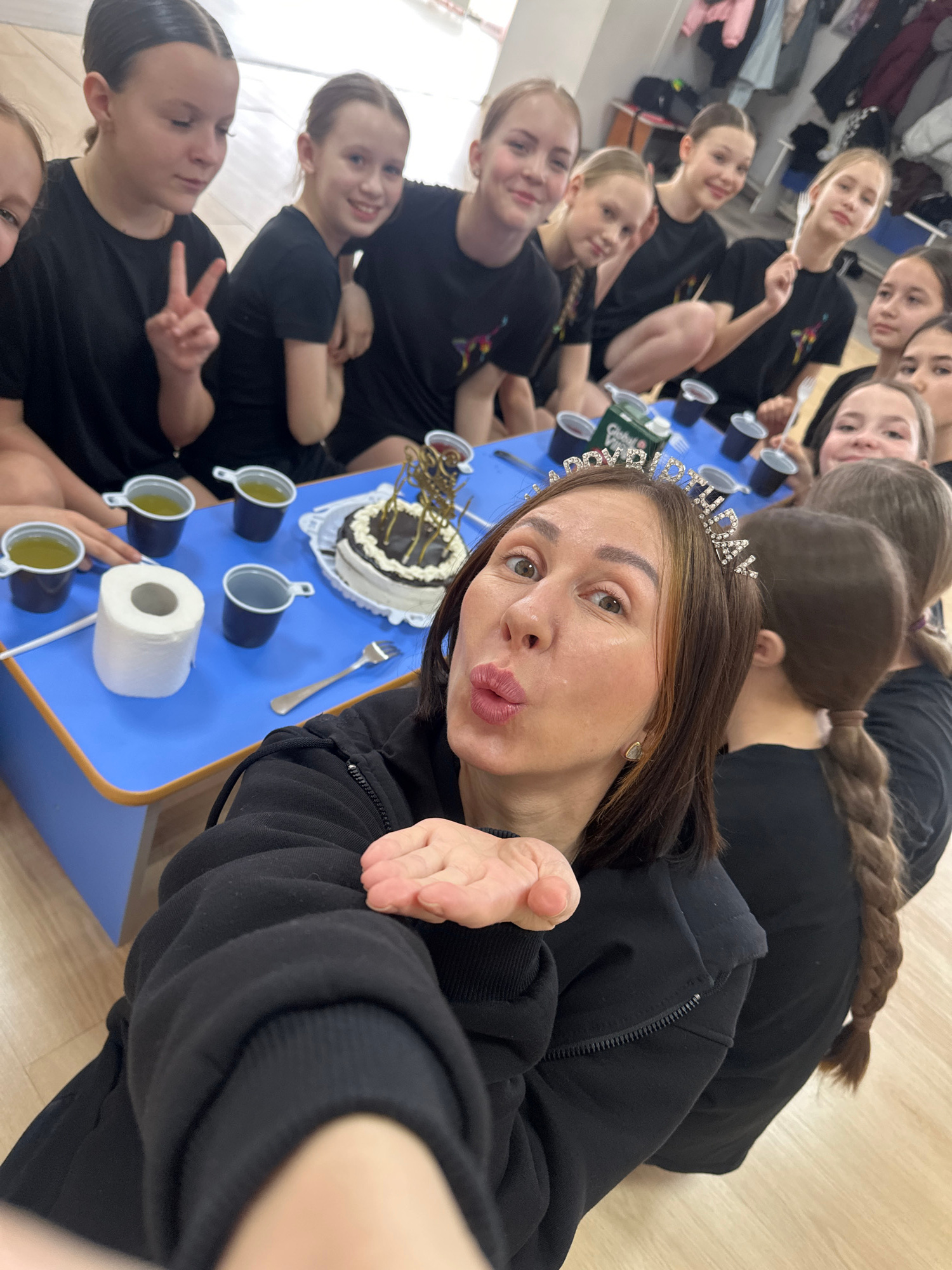 A high-angle selfie shows a woman wearing a "birthday" tiara, with a birthday cake and a group of young girls around a blue table. The scene appears to be indoors, potentially in a dance studio or sim…read more