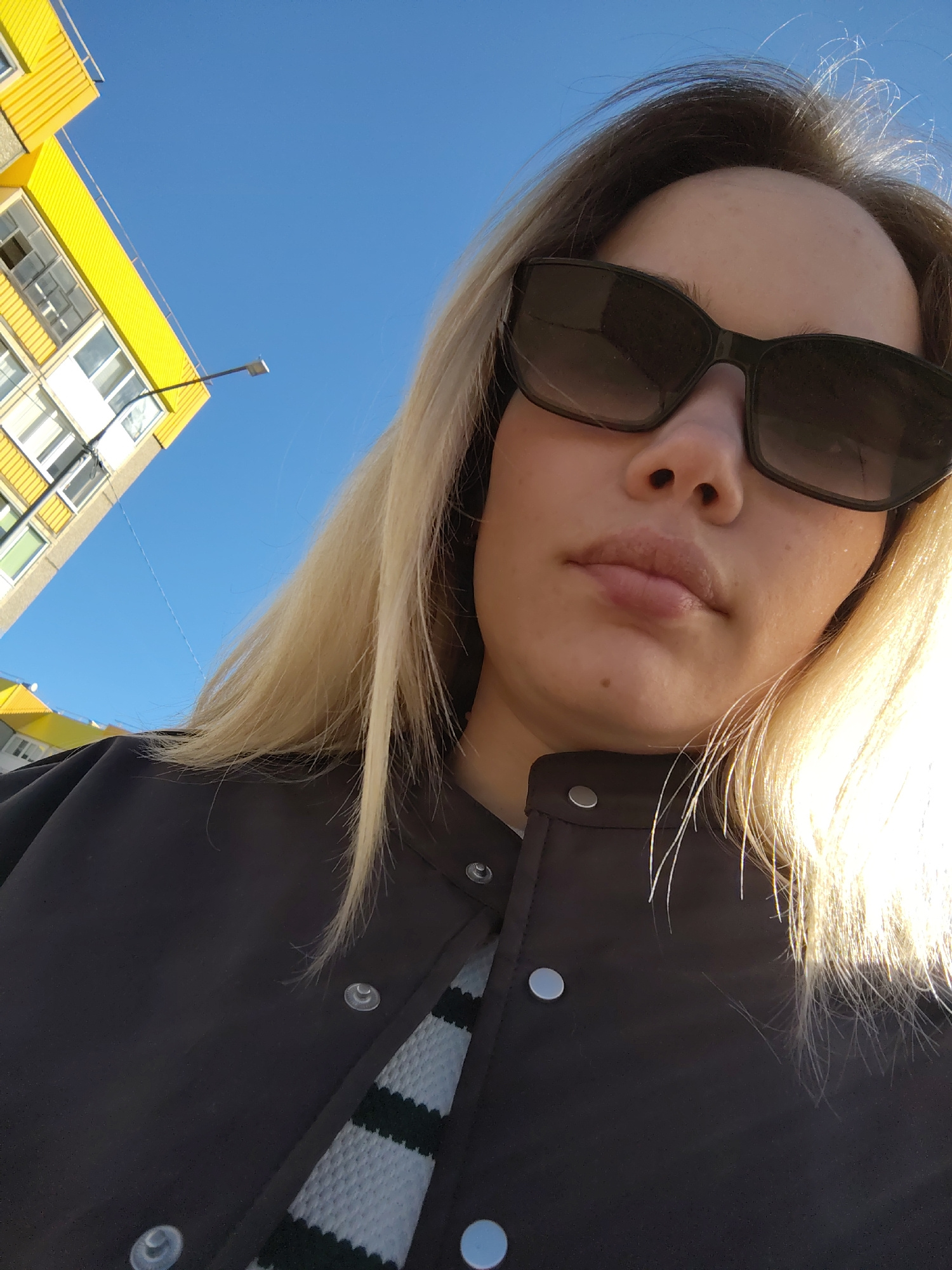 A medium-close-up, low-angle shot captures a woman outdoors, appearing to be taking a selfie. She is fair-skinned with long, blonde hair that cascades over her shoulders and is brightly illuminated by…read more