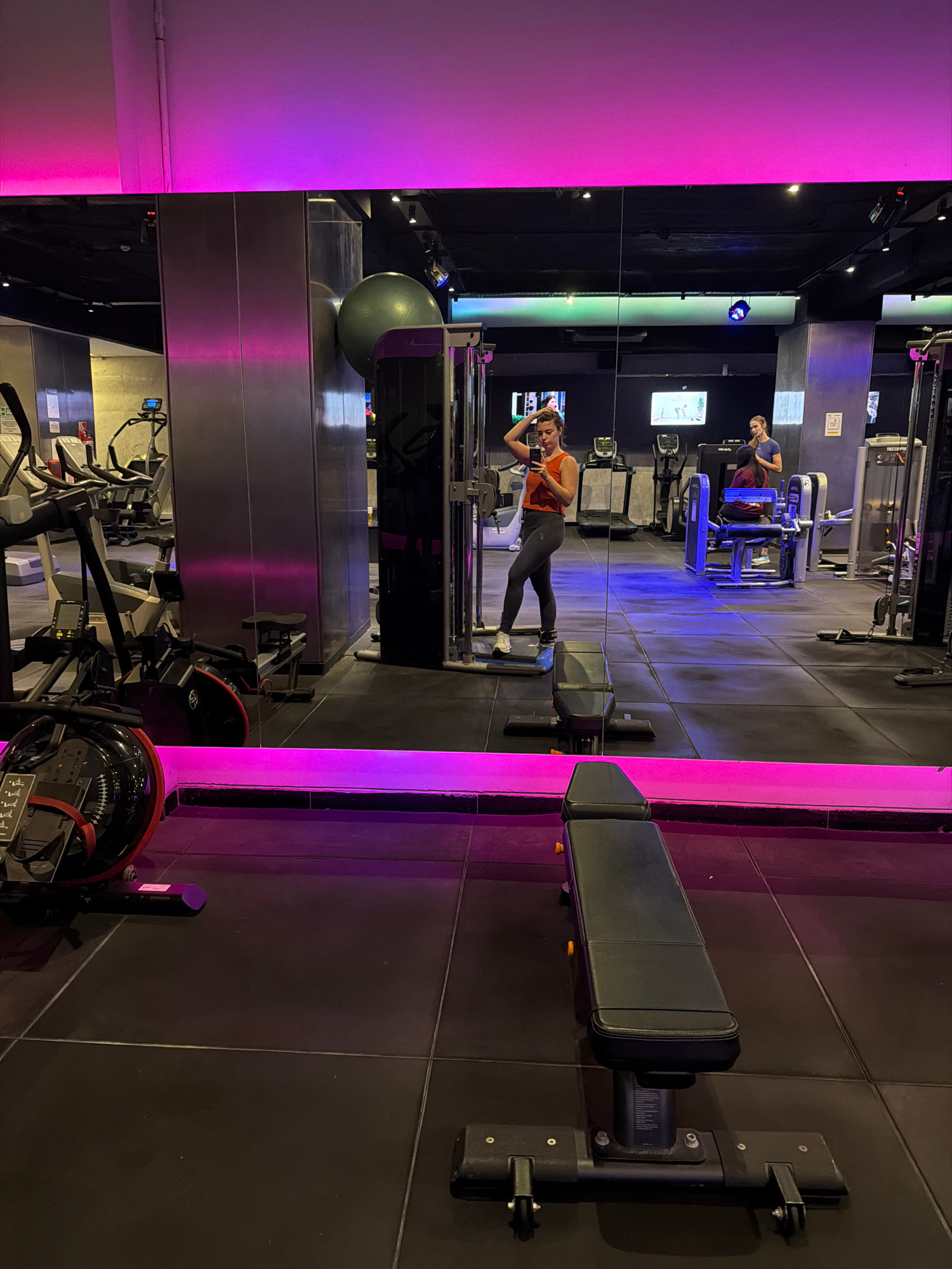 A brightly lit gym interior. A woman dressed in a red top and black leggings is seen taking a photo of herself in a mirror while leaning against gym equipment. In the mirror's reflection, another pers…read more