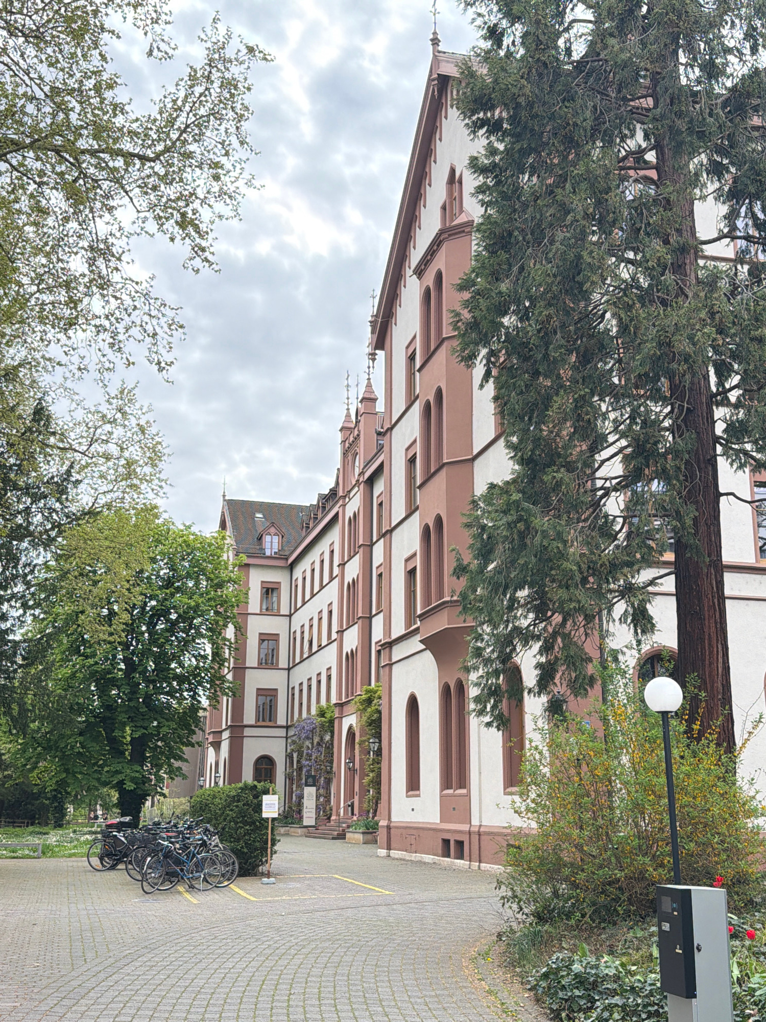 This image captures a multi-story building, likely part of the University of Basel, situated in an outdoor urban setting. The architecture is distinctive, featuring white facades contrasted with reddi…read more