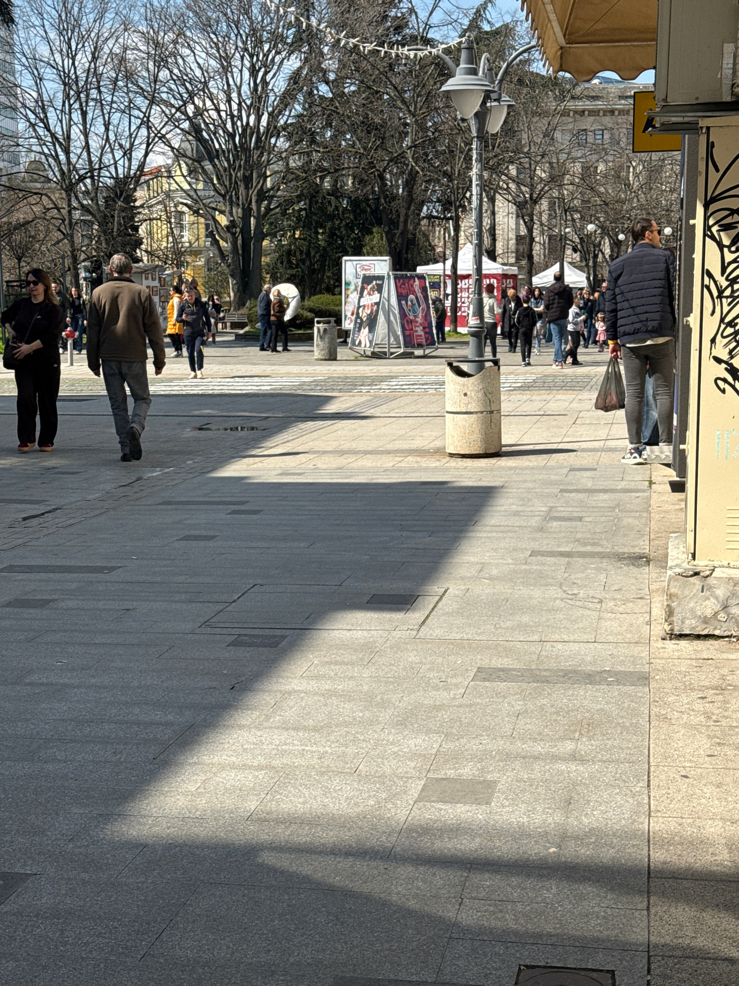 This photograph depicts a street scene in Burgas, Bulgaria, likely a pedestrian zone in the city center. The image is taken at ground level. The street is paved with grey stone and brick. The area is…read more