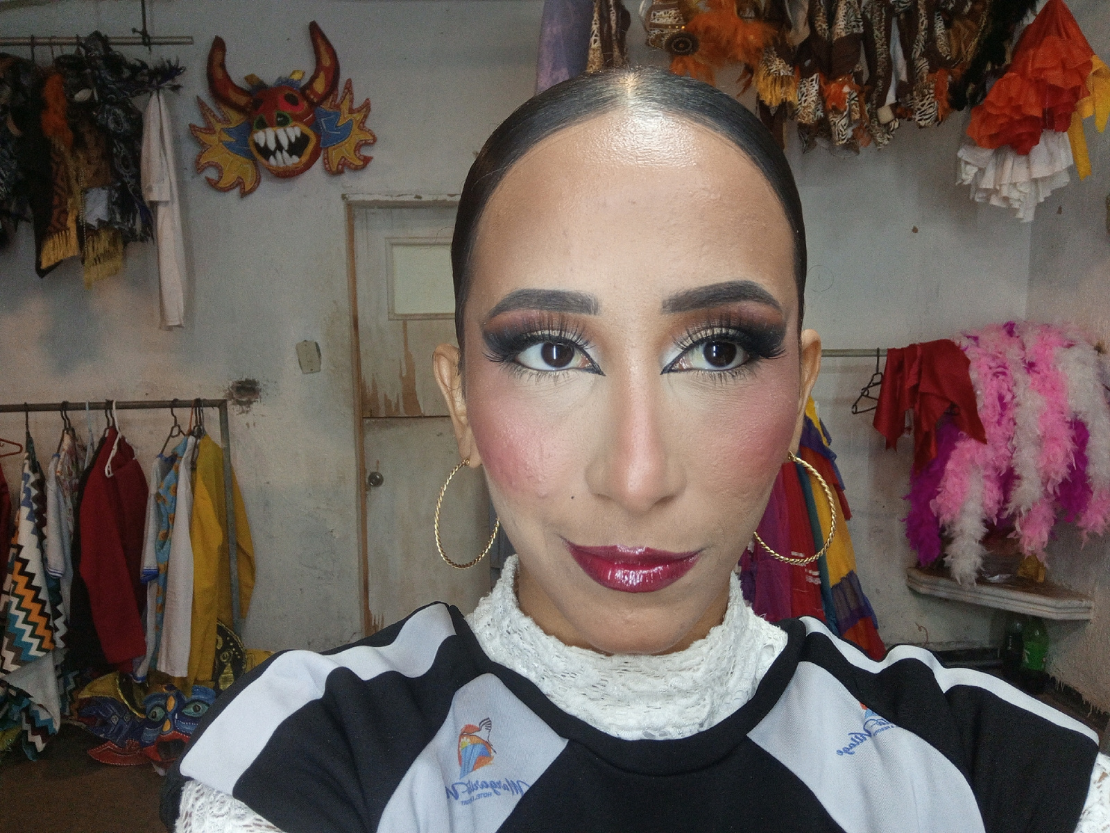 A woman with elaborate stage makeup and slicked-back dark hair looks directly at the camera in a chest-up portrait. She wears prominent winged eyeliner, false eyelashes, dark eyeshadow, rosy blush, anβ¦read more