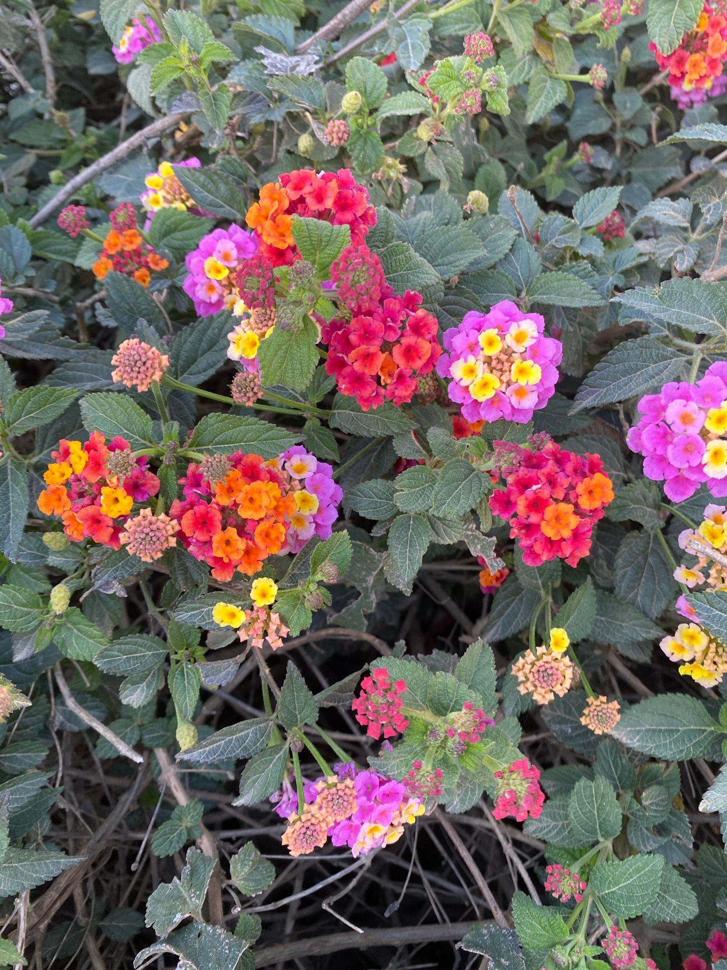 The image shows a cluster of Lantana flowers in various colors, including pink, yellow, orange, and red. The flowers are surrounded by green leaves with textured veins. The scene seems to be outdoors,…read more