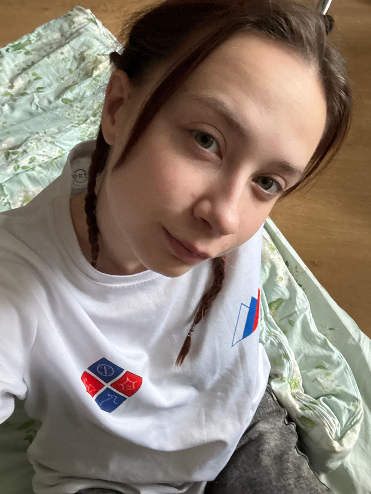 A young woman lies on what appears to be a bed. She wears a white long-sleeved shirt with two insignia near her shoulders: one consisting of blue, white, and red horizontal stripes, and another a diam…read more
