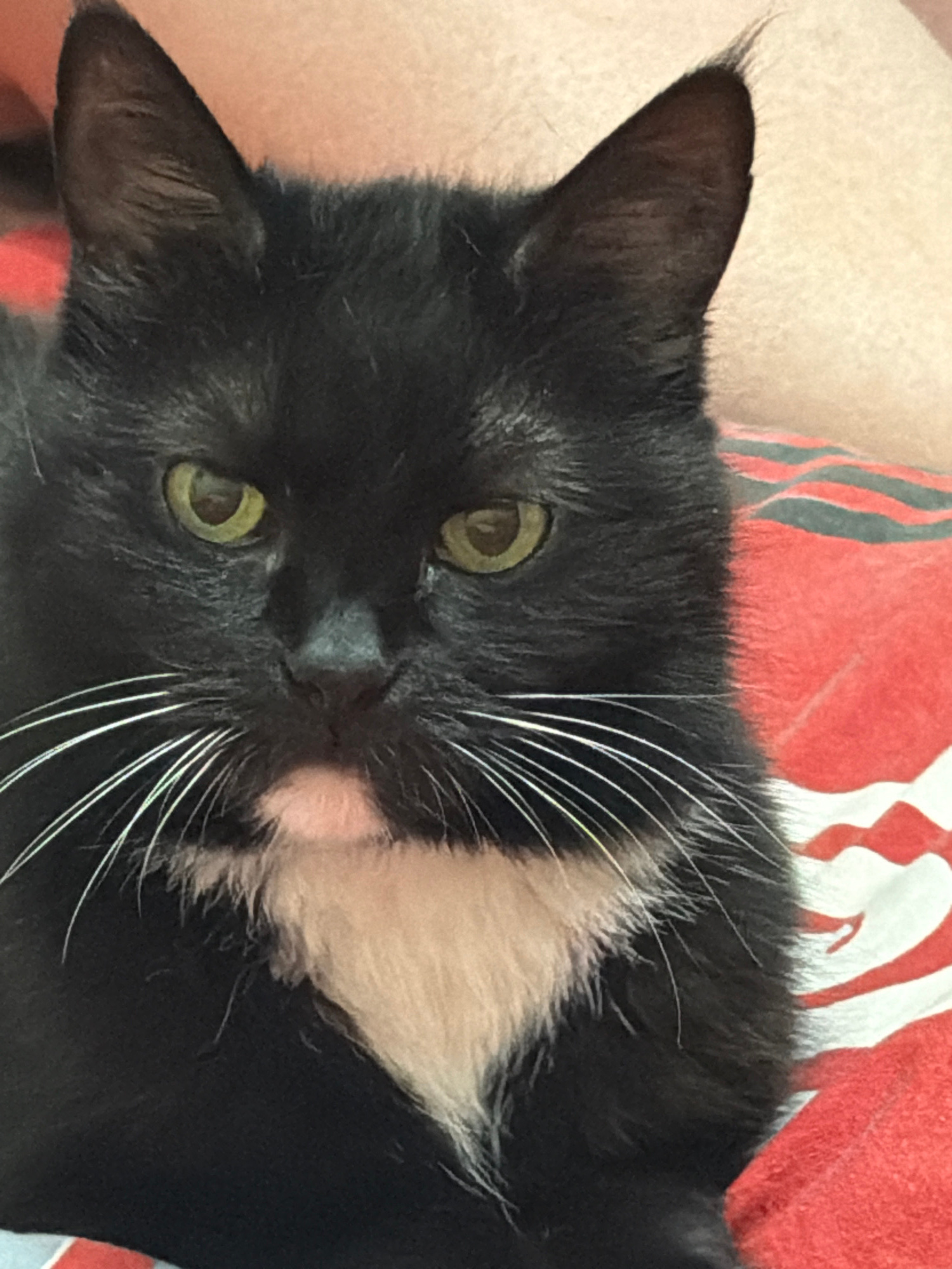A black cat with white whiskers and a white patch on its chest lies on a surface. The cat has green eyes and its head is tilted to the side. The background is partially blurred and shows a red and whi…read more