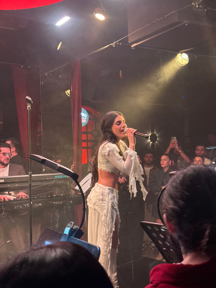 An indoor live music performance is captured at a dark, atmospheric venue in Yerevan, Armenia. The central subject is a young adult female vocalist with long, dark hair, styled with a partial braid, w…read more