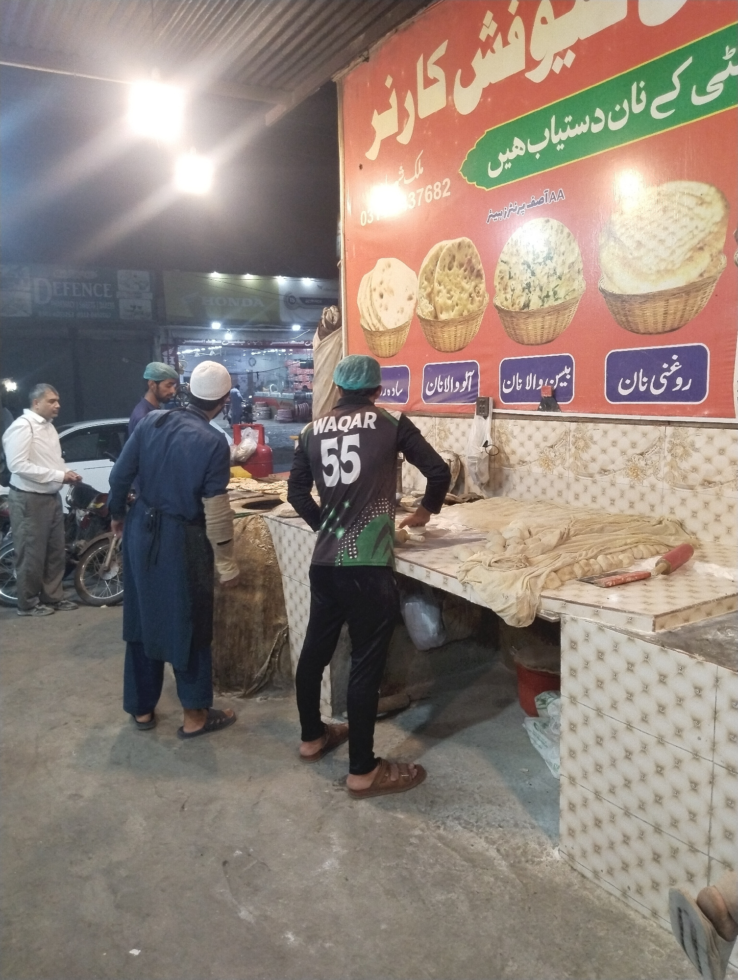The image depicts a nighttime street scene in Heir, Pakistan, centered around a bustling naan (flatbread) shop named "Yousaf Corner." A large, vibrant red and green signboard, written in Urdu, promine…read more