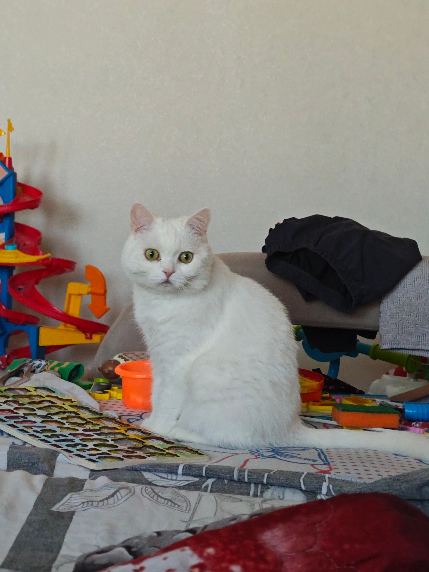 The image depicts a white cat sitting on a bed covered with various objects, seemingly toys and clothing. To the left of the cat is a toy track set in red, yellow, and blue colors. Next to the cat and…read more