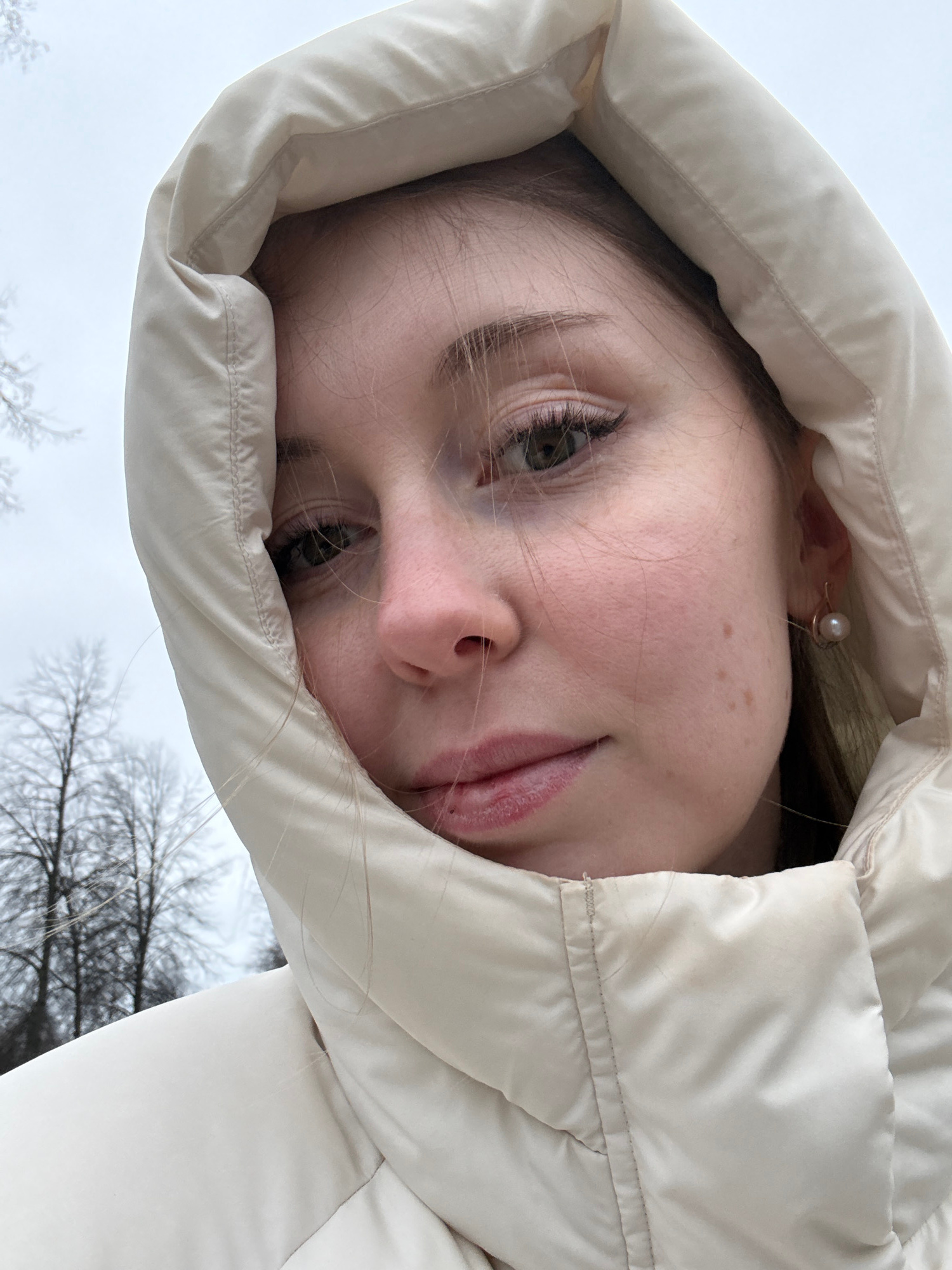 A close-up, slightly angled shot depicts a young woman's face framed by a light-colored, possibly white, puffy jacket hood. The woman has fair skin with freckles and light-colored hair. She wears a pe…read more